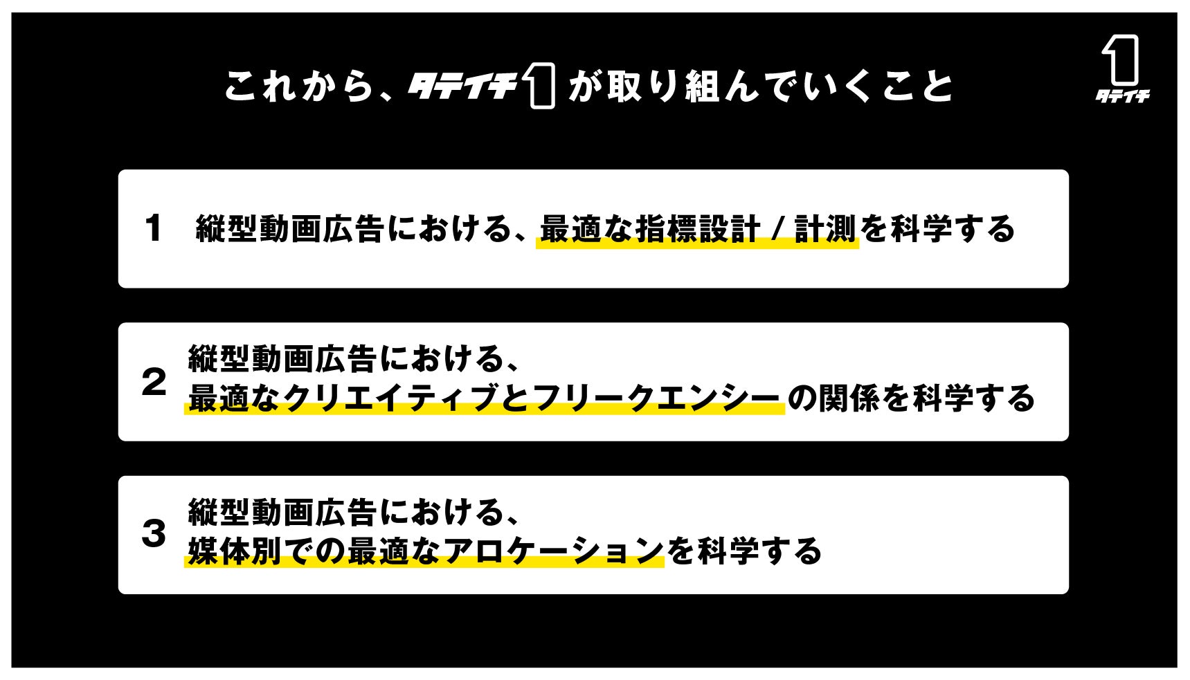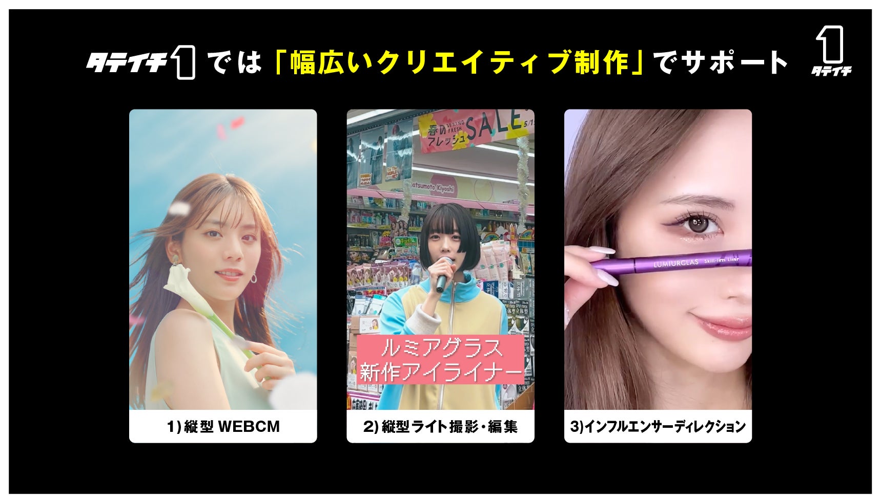 今後、縦型動画コンサルティングスタジオ「タテイチ」では、キャスティング力・ディレクション力、クリエイティブ企画・制作力、広告配信設計・運用力を用いたプロフェッショナルが伴走させていただだき、幅広いクリエイティブ制作を企画、提案、実施し、最適な指標設計/計測、最適なクリエイティブとフリークエンシーの関係、縦型動画広告における、媒体別での最適なアロケーションを科学し、成果最大化に貢献して参ります。
