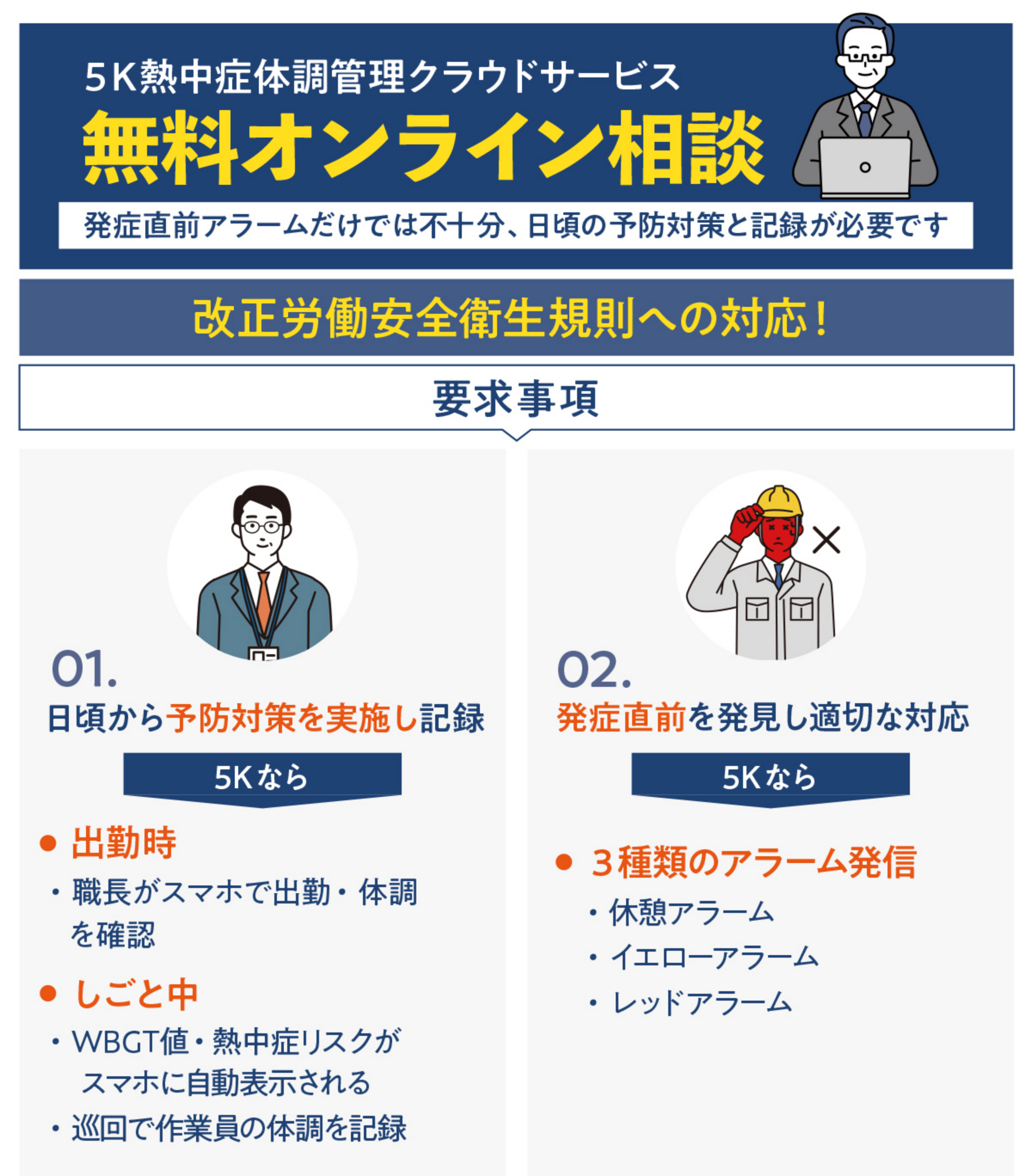 5Kサポート株式会社(本社:横浜市、代表:中野吉雅)は、建設・製造業など暑熱環境下で働く現場向けに提供する「5K熱中症・体調管理クラウドサービス」について、真夏前の熱中症対策強化に向けた情報発信を開始しました。