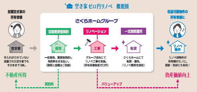 当サービスは空き家所有者から、さくらホームグループが建物を借り上げ、リノベーションを実施した上で、一定期間転貸することで空き家を活用する仕組みです。
