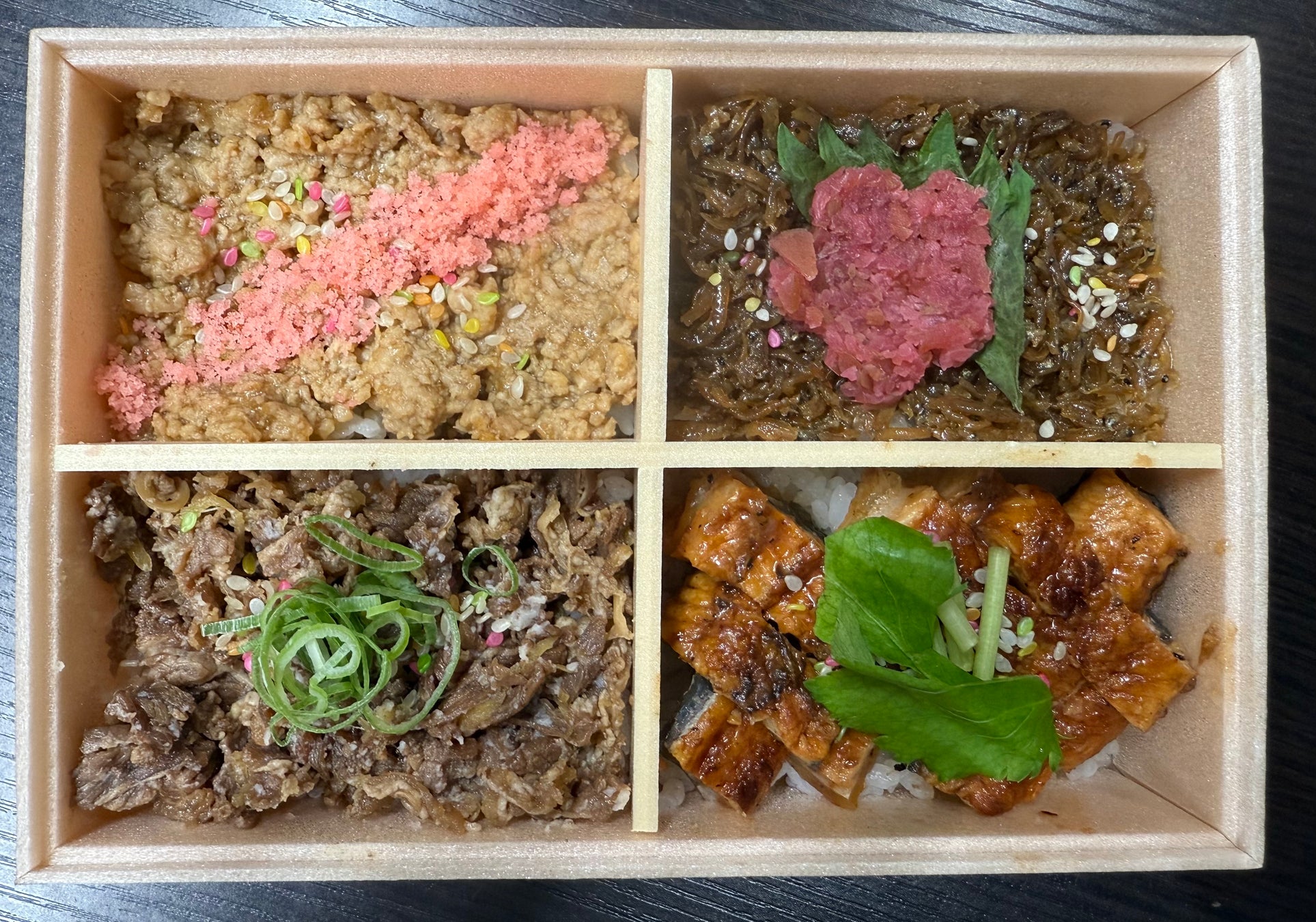 日本初のおだしのテーマパークである「京都離宮」の利き出汁のメニューである、離宮のおだし、あごだし、かつおだし、京さわらだしの4種類の出汁をそれぞれ使っただし巻きが弁当箱の中で夢の共演。