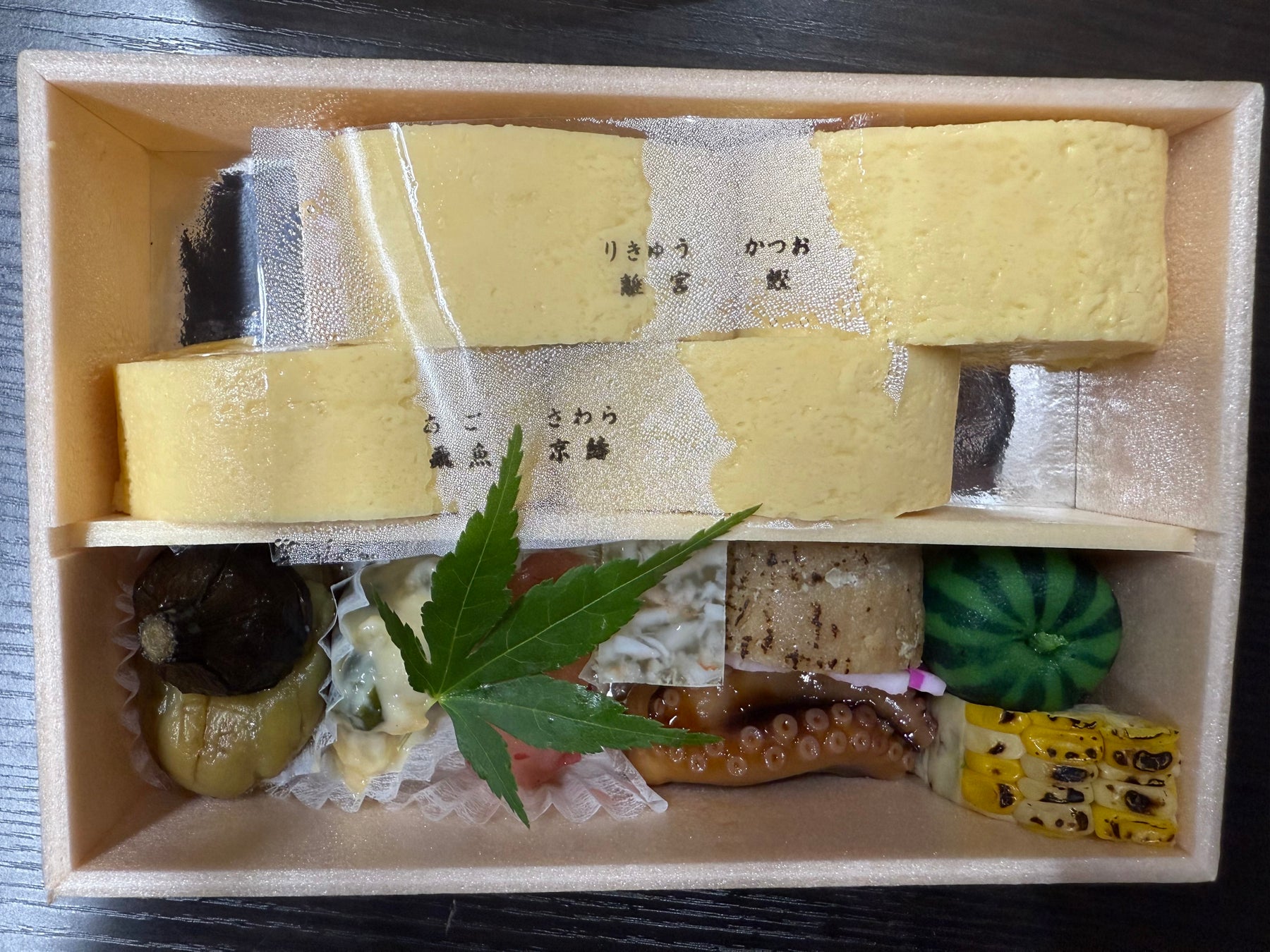 上部には、京都離宮のこだわりが詰まった 四種の出汁のだし巻きをひとつずつ丁寧に詰め合わせました。一口ごとにそれぞれの出汁を感じ、香り、旨みの違いをお愉しみいただけます。