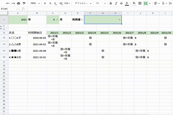 そうすると、年月を選んだときに対象の利用者を自動的に絞り込むことができます。