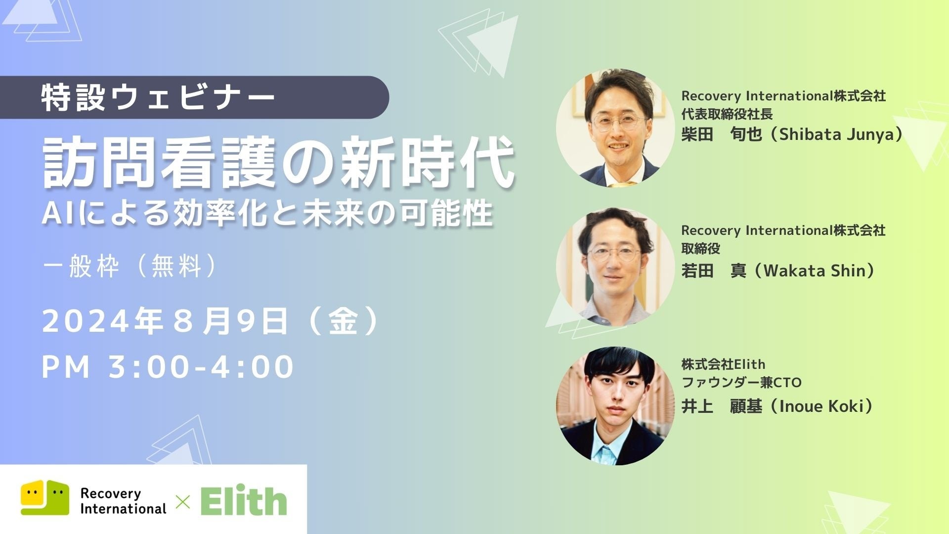 最新AI技術を手掛ける 東大 松尾研発スタートアップ®の株式会社Elithが訪問看護での実用化に向け、Recovery Inetrnational株式会社とウェビナーを開催いたします。