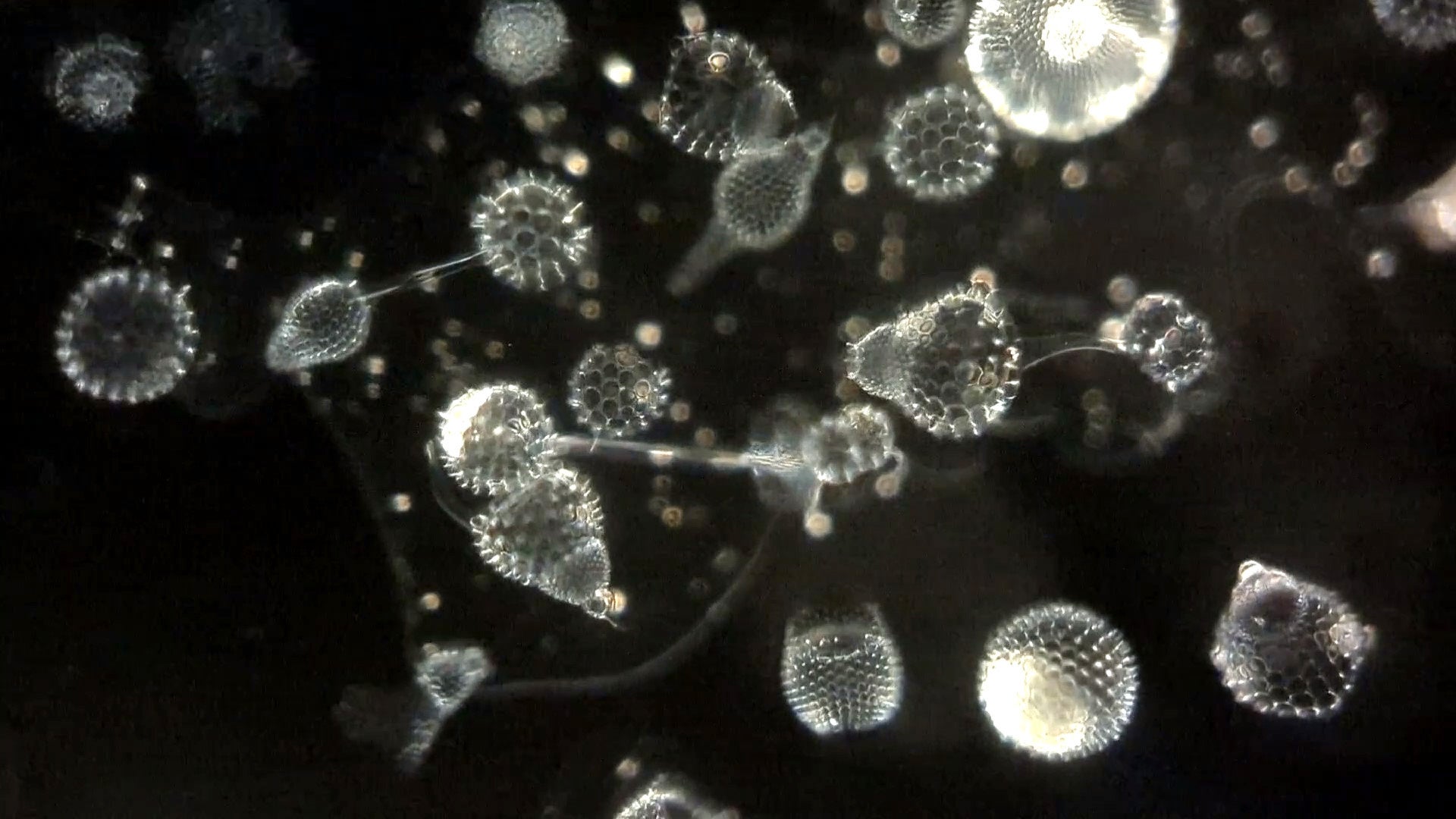 (上画像:放散虫。ミクロハンターキットPLに付属のレンズ、X100Pで撮影した偏光顕微鏡写真。)