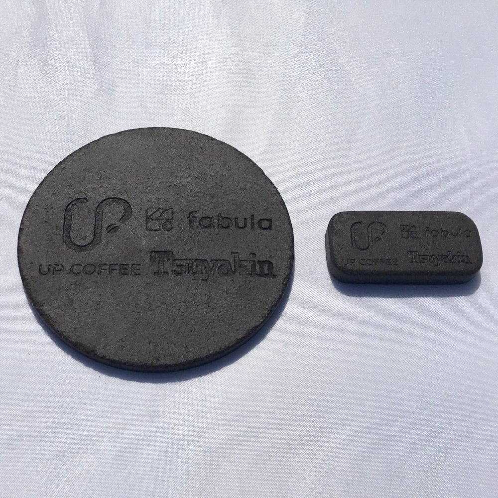 GOOD COFFEE FARMSの店舗でドリップした後のコーヒーかすを、艶金で染色材料として使用し、染色後に残ったコーヒーかすを、東京大学発ベンチャーのfabulaが保有する熱圧縮技術によって、コースターとカトラリーレストにアップサイクルしました。