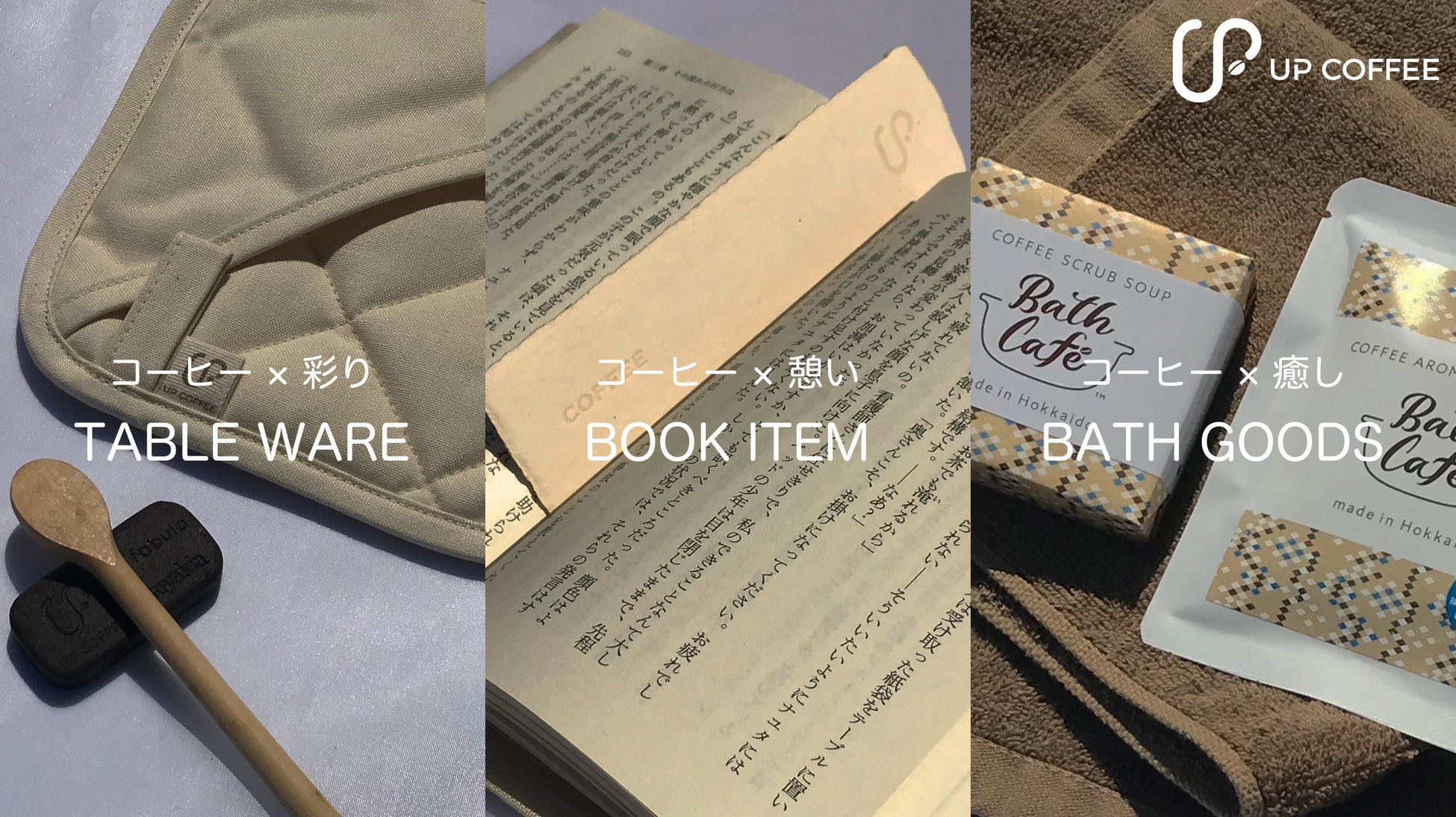 ①コーヒータイムに彩りを加える「テーブルウェア」、②憩いの読書タイムを共にする「ブックアイテム」、③癒しのバスタイムを演出する「バスグッズ」という3つのテーマで開発したアップサイクル10アイテムを展示します。