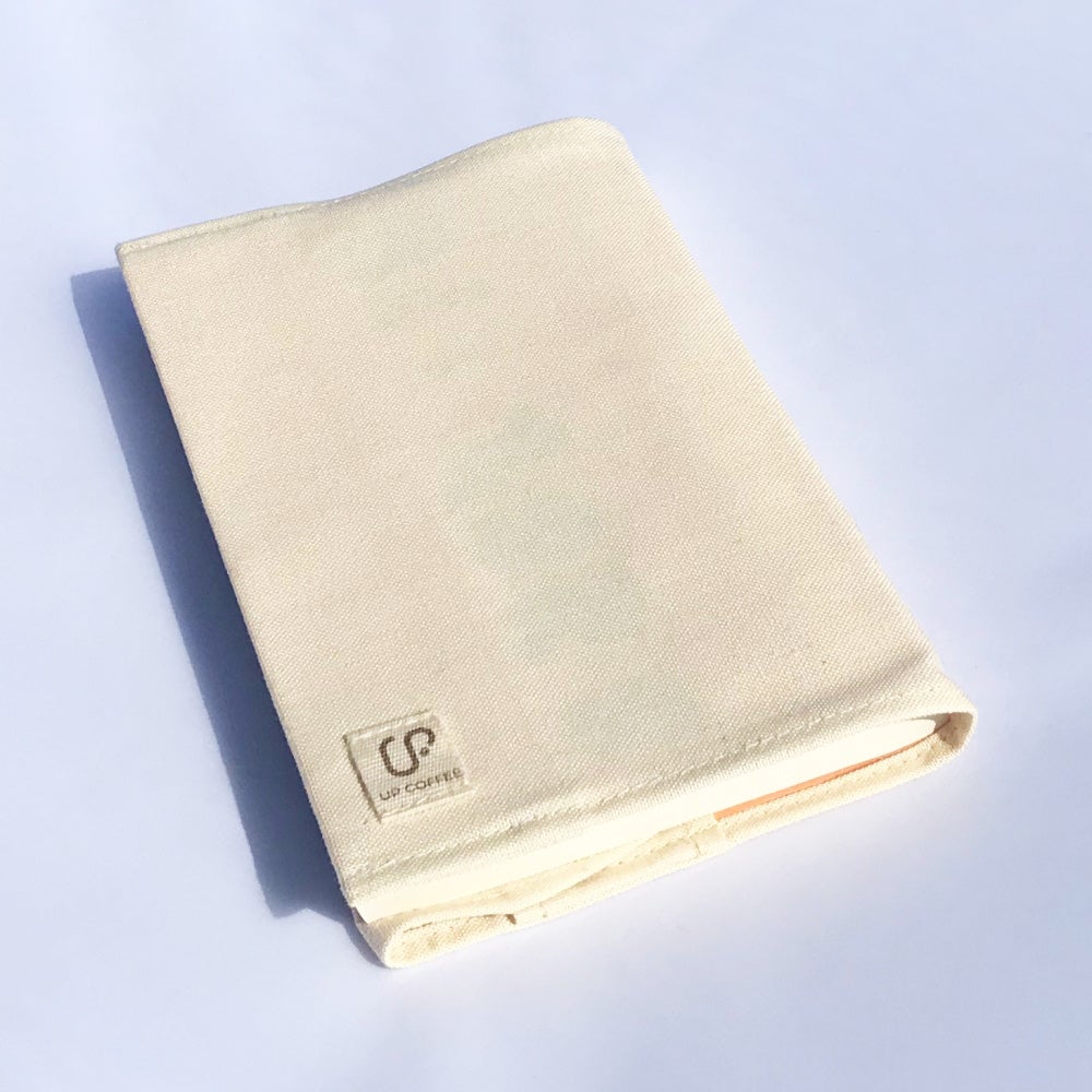 GOOD COFFEE FARMSの店舗でドリップした後のコーヒーかすを、布をコーヒー色に染める ”染料” として利用することで、ブックカバーにアップサイクルしました。