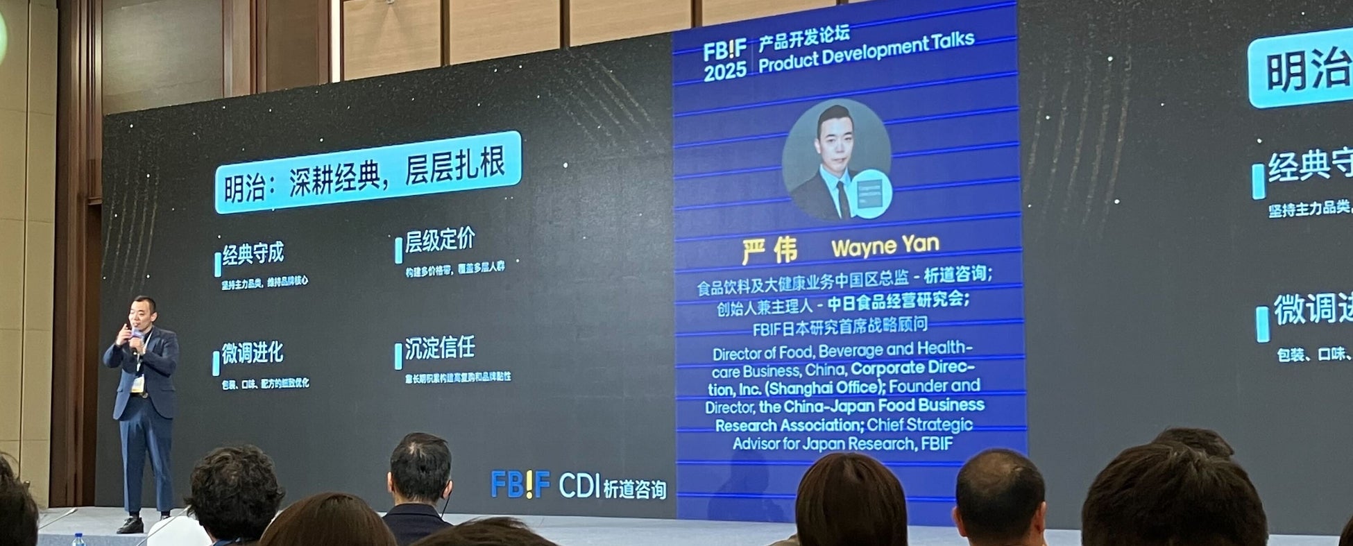 本フォーラムは、7,400名以上の食品業界関係者が参加し、Nestlé、Kraft、Yakult、Meiji、可口可乐、伊利等、国内外の主要企業が一堂に会する業界最大級のイベントです。今回、CDI-Chinaの食品飲料及びヘルスケア領域ディレクターであり、日中食品経営研究会の発起人もである厳 偉(げん い)が、「不打别人的仗(他人の戦をしない)」をテーマに登壇。 中国食品企業が“模倣疲れ”とトレンド追従の限界に直面する中、企業戦略の再構築と「自分の戦をする」ことの重要性を提言しました。