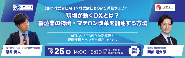 本セミナーでは、自動倉庫や内製化支援で注目される ROMS株式会社 と物流DX・WMSコンサルティングに強みを持つ 株式会社APT が共催し、製造現場DXの進め方、特に物流・マテハン分野での改革を加速する方法を、事例や過去の知見を交えて解説します。