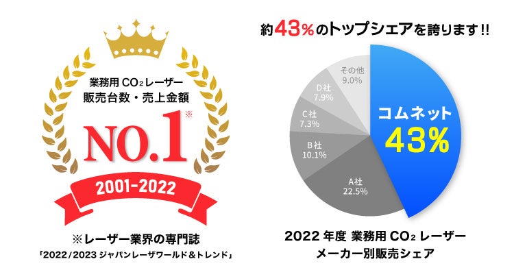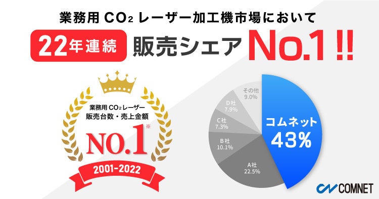 レーザー加工機・レーザーカッター販売のコムネットが、22年連続で販売台数・売上金額No.1を達成!国内販売において業界トータル販売数の約43%のシェアを獲得。