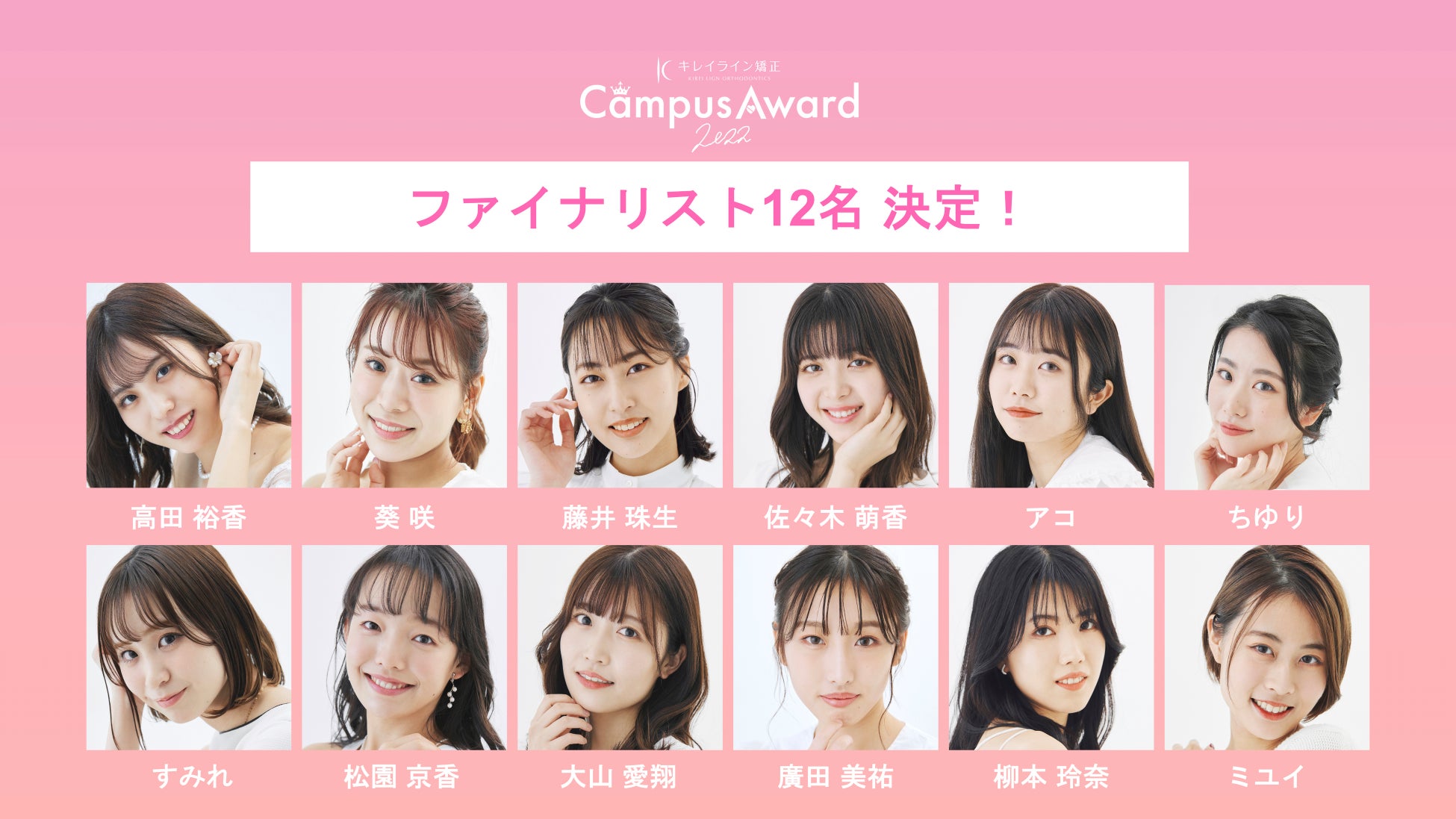 株式会社キャリー(本社:東京都渋谷区)は、メインプロデュースに日本最大級のファッション&音楽イベント「GirlsAward」を迎え、全国の女子大学生・専門学生を対象とした日本最大級のキャンパスミスコン「キレイライン CampusAward 2022」を開催しております。この度、ファイナリスト12名が決定し、ついに明日3月12日(土)からFinal Stageの審査が開始されます。
