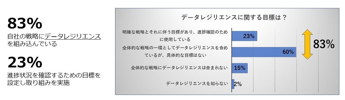 83%が、自社の戦略にデータレジリエンスを組み込んでいると回答しています。しかし、進捗状況を確認するための目標を設定した、成熟した取り組みを行っているのはわずか23%にすぎませんでした。