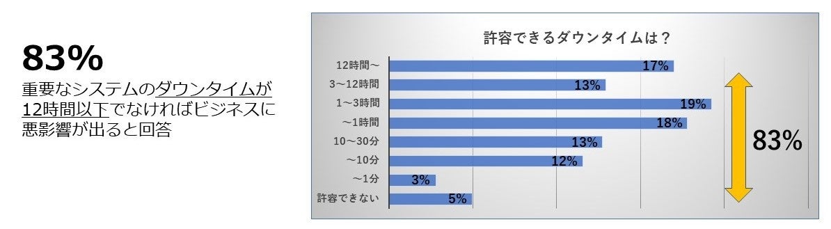 回答者の83%は、重要なシステムのダウンタイムが12時間以下でなければビジネスに悪影響が出ると回答しています。しかし、深刻なデータ損失から12時間以内に復旧できたのは52%のみで、29%は24時間以上データを回復することができませんでした。