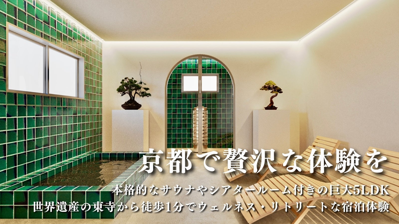 扉の向こうは、エレベーター付きの三階建ての宿泊者様だけの特別な空間が広がる。本格的なプライベートサウナとシアタールーム、ダイニングルームを新設。常に適度な距離感でお客様をおもてなしする、専属のバトラーによる送迎等のおもてなしサービス。更に、オプションで京都を感じる体験と“WELLNESS”を体感できるツアーも用意。