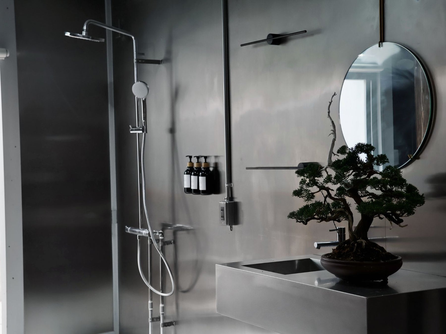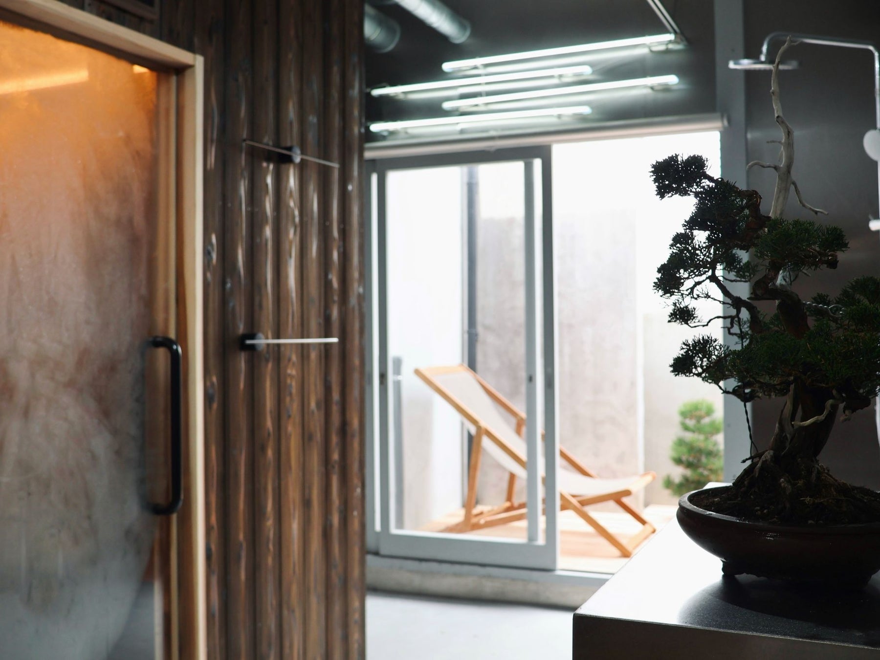 併設された朝から夜まで利用いただけるサラダカフェの『ルートツー青果店』は、ゲストの健康状態やサウナ利用を最大限にサポートができる、Wellnessをコンセプトにしている。そのカフェを抜ければ完全プライベート空間へ。