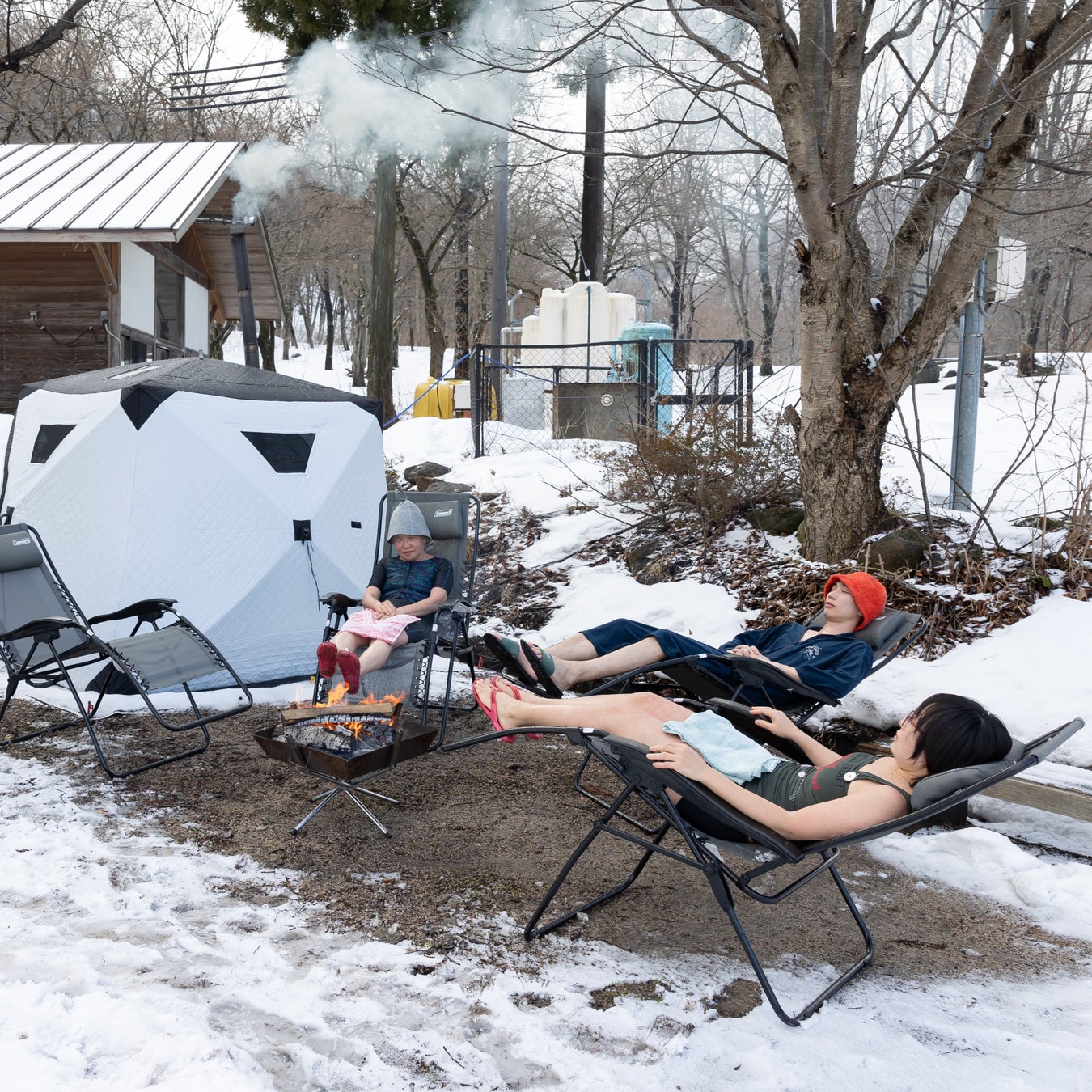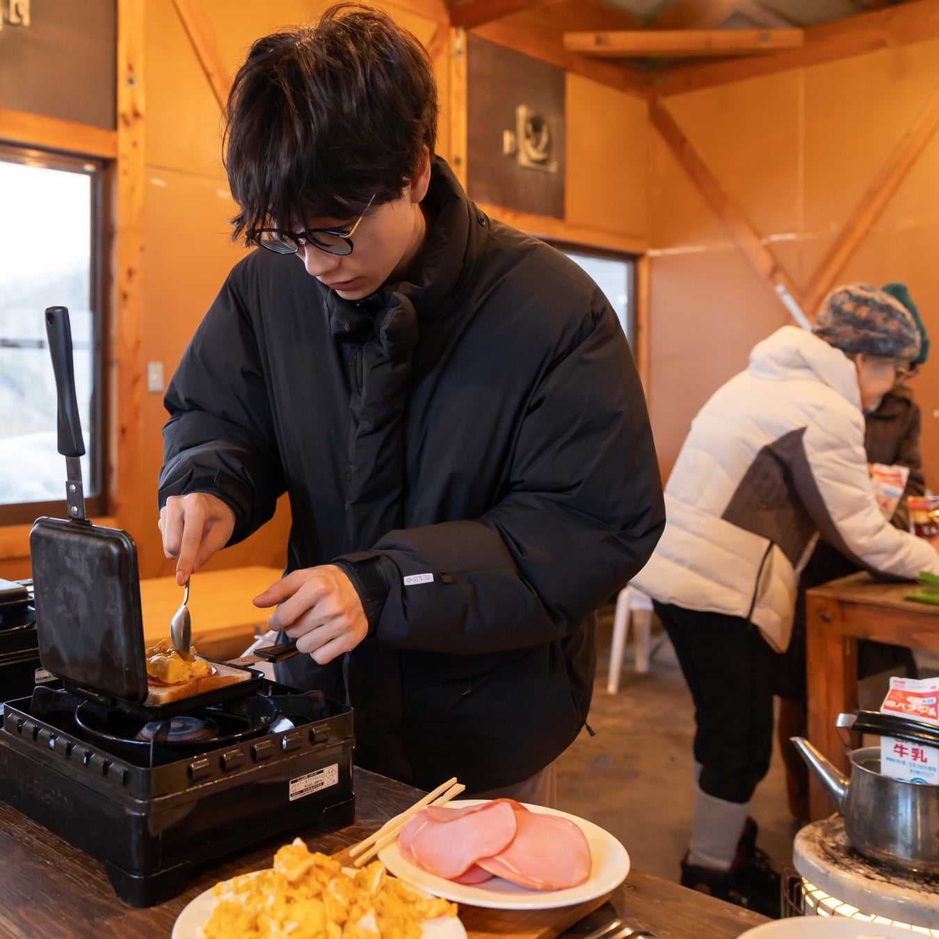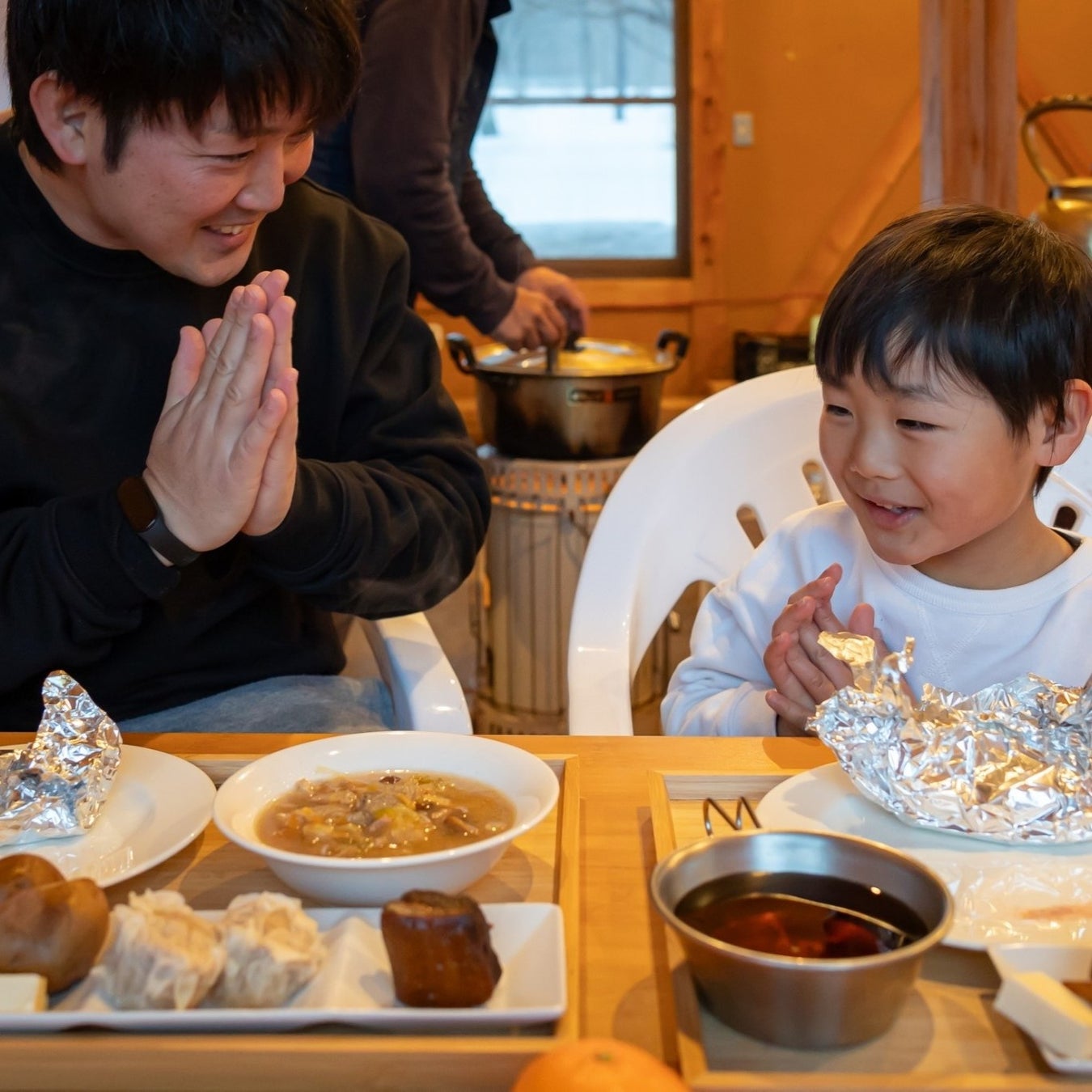 サ飯は、脱水を防ぐ温かな汁物各種を中心にボリュームのある肉料理や点心、フルーツもたっぷりと。朝食メニューは食材を用意、自分たちで作るホットサンドで参加者同士の会話が楽しく弾みました。また、除雪から作った雪山でソリやスノーシューなど、サウナに入らないお子様も一緒に遊べて大喜び。冷え込む夜は暖かい室内でキャンプ場ならではのテント泊を体験。スタッフも別室に寝泊まりして、万が一の際に備えました。