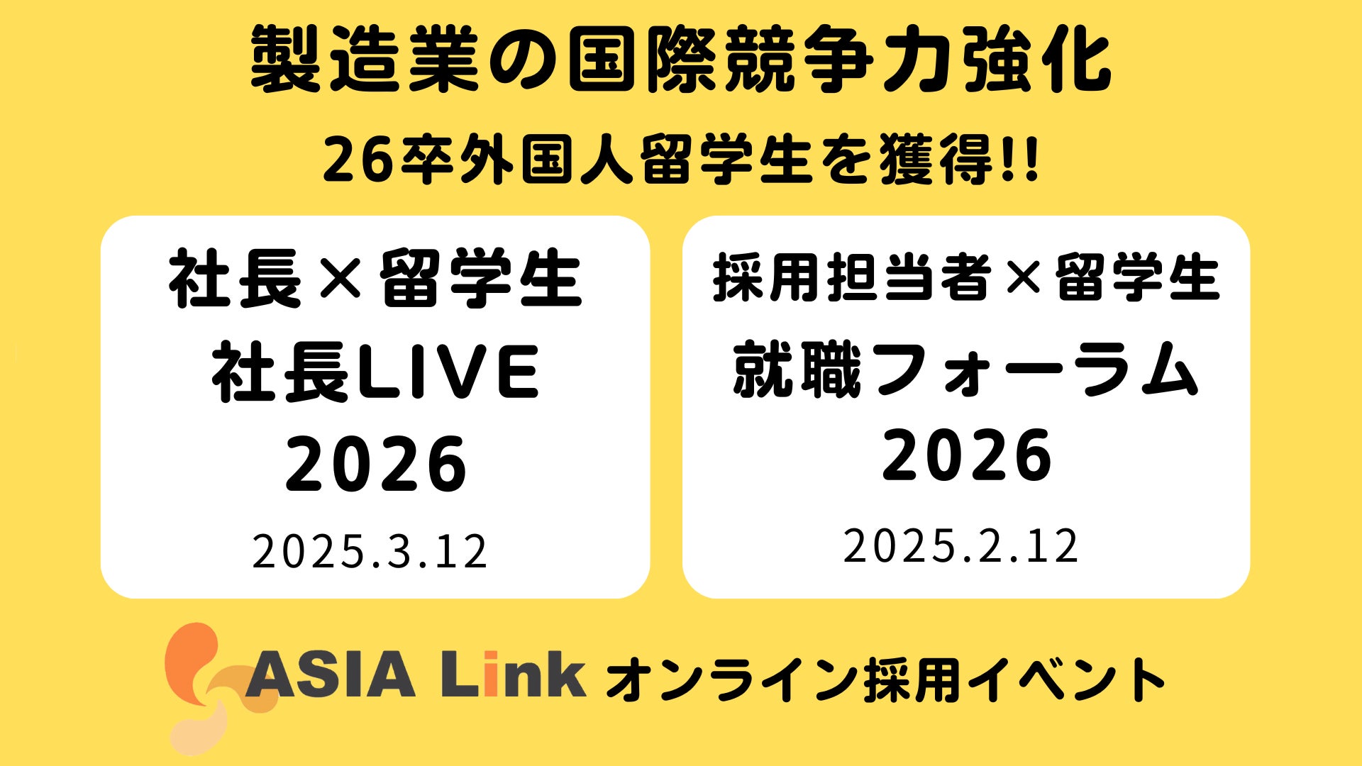 外国人留学生と製造業をつなぐ人材紹介会社 株式会社ASIA Link(本社:東京都小平市、代表取締役:小野朋江)は、製造業が国際化と技術力強化を担う人材を獲得することを目的に、26卒外国人留学生対象の採用イベントをオンラインで開催します。このイベントは、製造業の経営者や採用担当者が、外国人留学生と直接対話できる貴重な機会です。