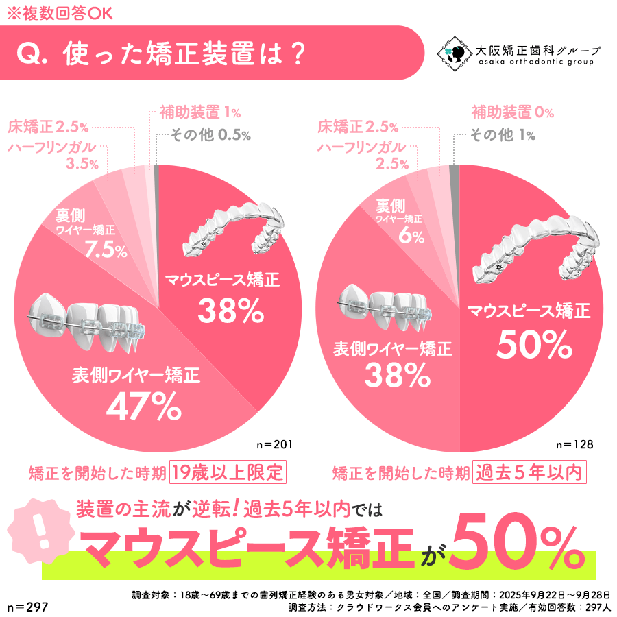 矯正装置は「マウスピース矯正」が50%で最多に。表側ワイヤー矯正(38%)を上回り、装置の主流が逆転。