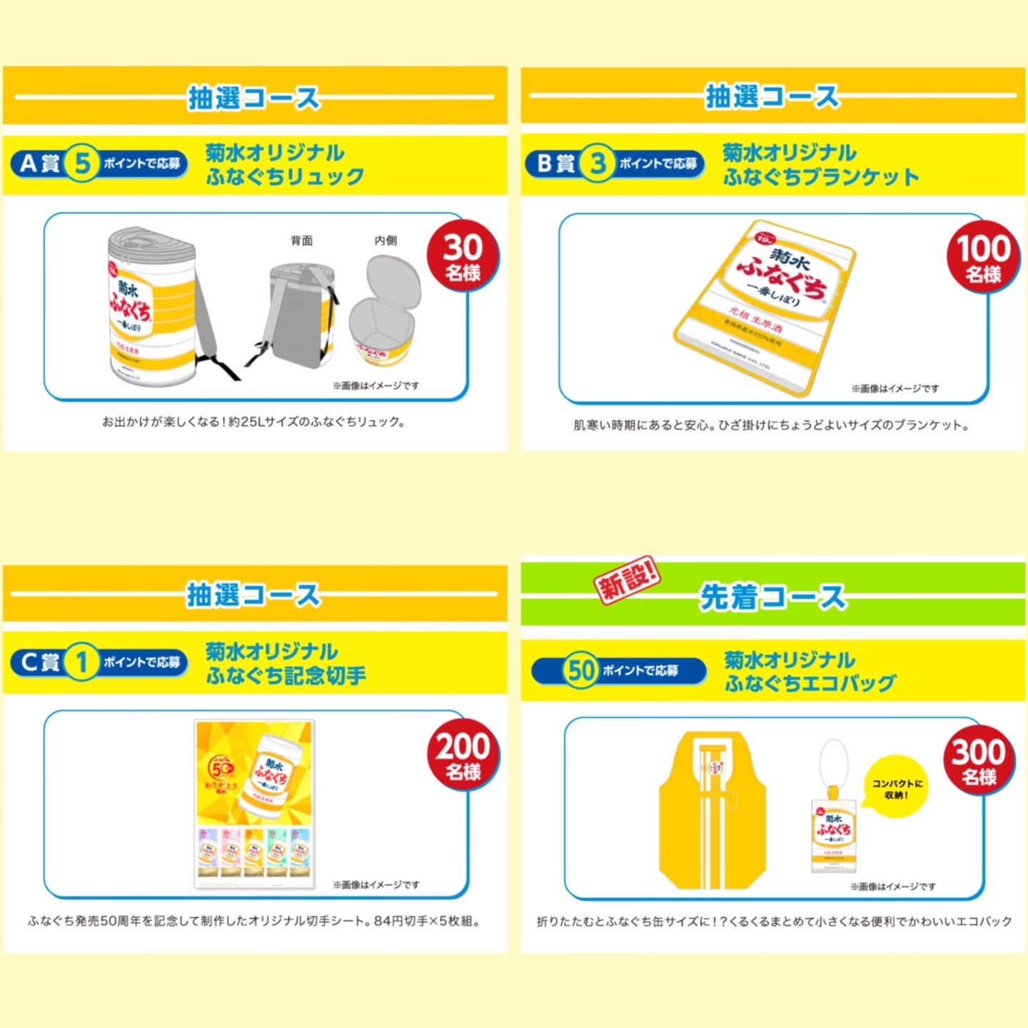 抽選コースと先着コースがございます。総勢630名様に菊水オリジナルのふなぐちグッズをプレゼントいたします。