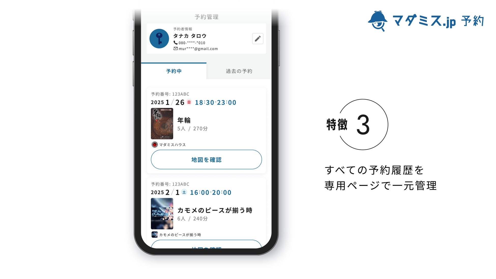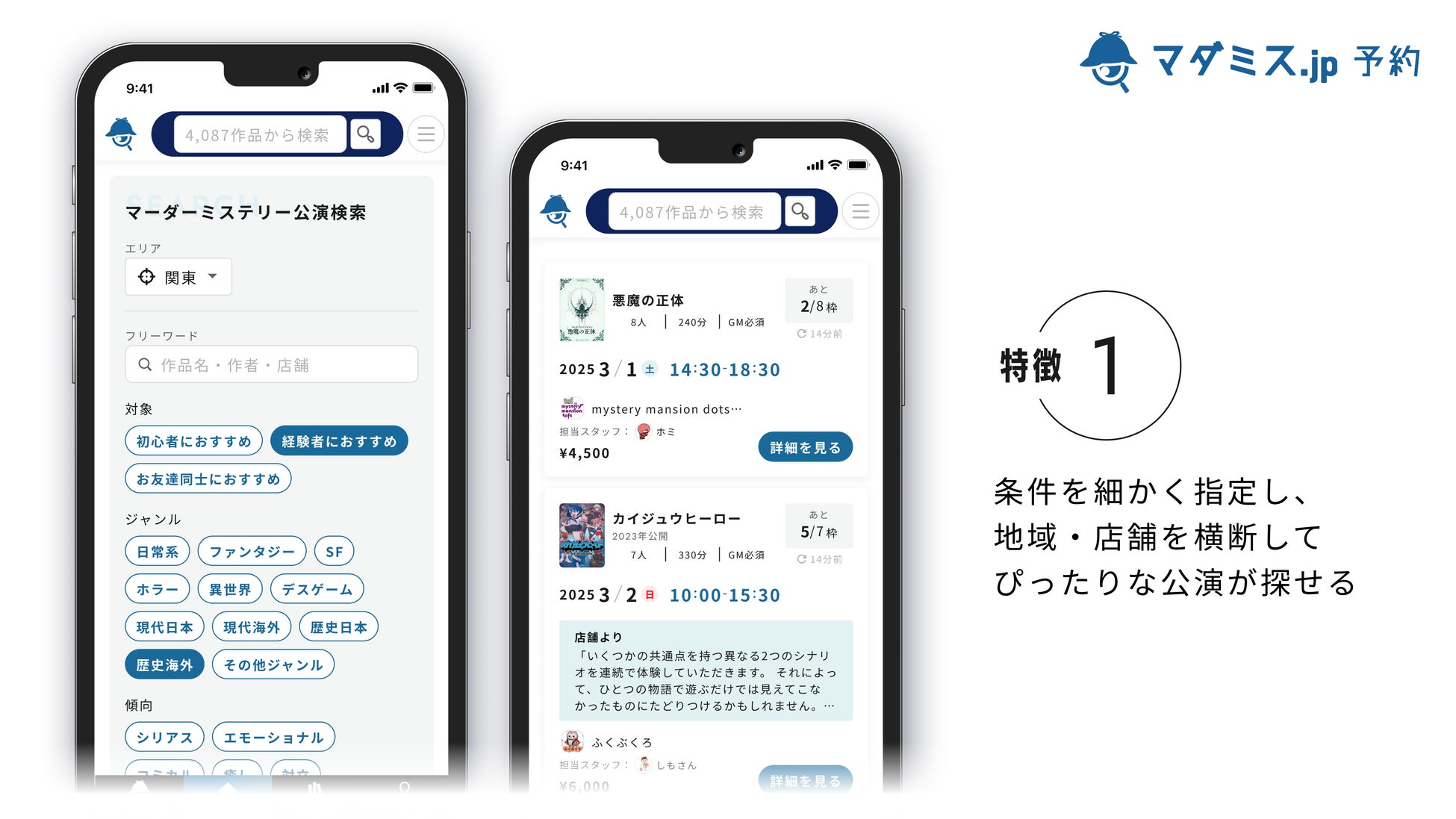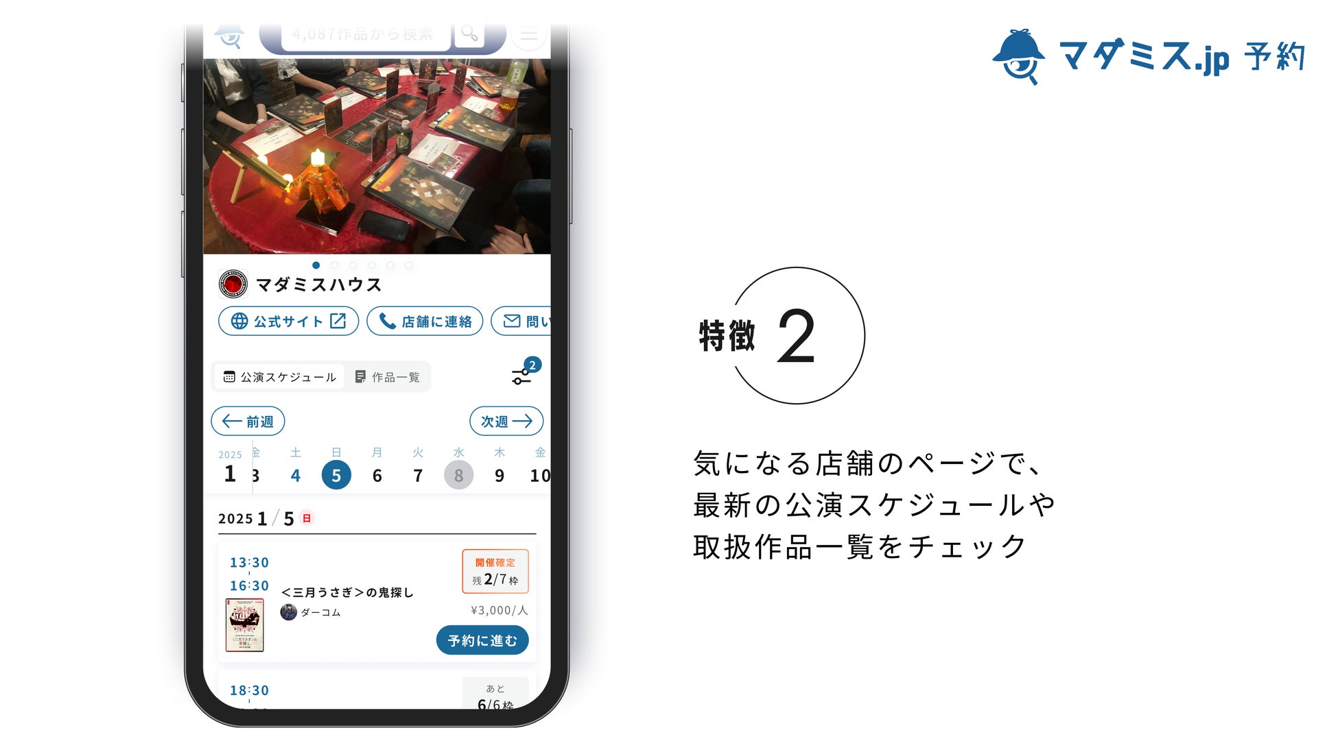 現在、国内にはマダミス専門店やマダミス公演を開催するボードゲームカフェ等が約50店舗ほどありますが、店舗ごとに異なる予約方法や公演情報がわかりづらいという課題が存在し、「遊びたいけど予約がしづらい」という声が寄せられています。