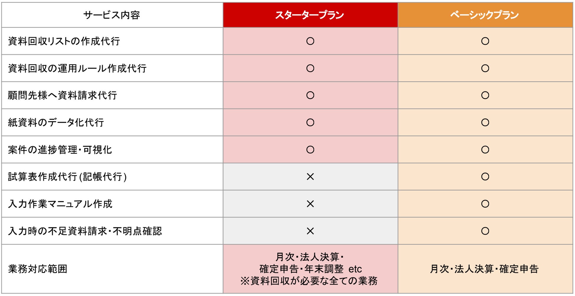 単純な工数削減のためのアウトソーシングサービスは多数存在しますが、私たちが提供するサービスは、資料回収業務に加え、業務の体系化、進捗の可視化、紙資料のデジタル化、試算表作成代行や作業マニュアル作成など、業務の標準化を含む代行サービスです。