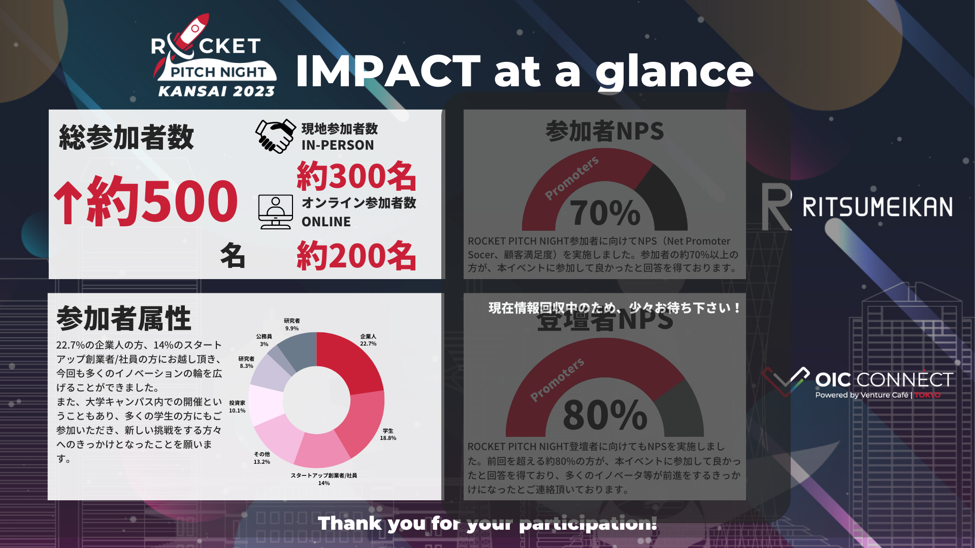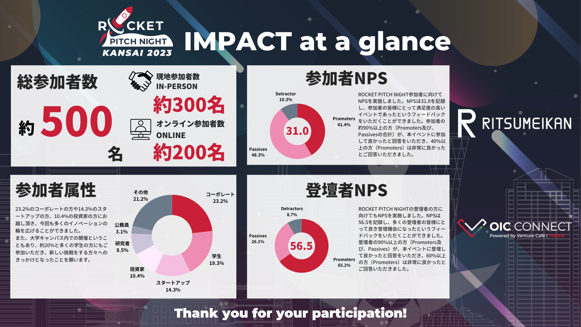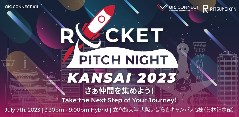 世界15都市に展開し、イノベーションを加速させる様々なプログラムを提供するグローバルなイノベーション・コミュニティであるVenture Café Tokyo(所在地:東京都港区、エグゼクティブ・ディレクター:山川 恭弘)は同コミュニティが立命館大学と共催のもとおこなっているOIC CONNÉCTが1周年を迎えるにあたり、ROCKET PITCH NIGHT KANSAI 2023を開催し、40組の起業家・スタートアップが登壇、約500名が参加し、多くの挑戦者達と支援者達の交流が生まれました。