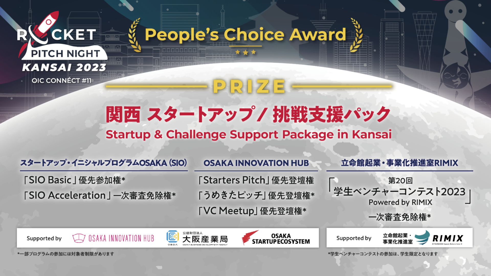ROCKET PITCH NIGHT KANSAI2023では、オーディエンスからの投票を通じて各カテゴリーにおけるPeople's Choiceを参加者の投票により選出いたしました。受賞者は、関西各地で開催されるスタートアップ・プログラム/ピッチへの優先参加権等を獲得いたしました。
