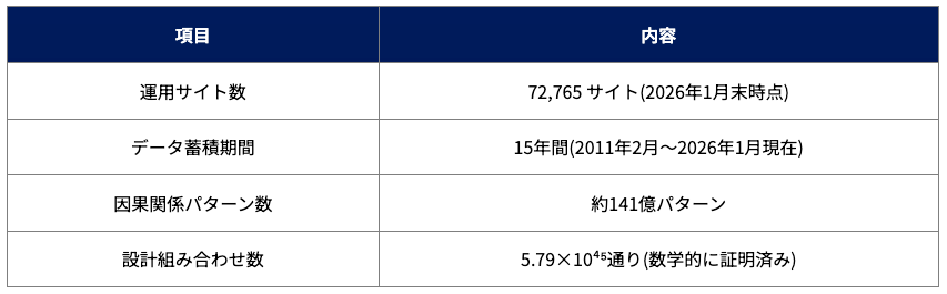 そして今、15年間・72,765サイト・約141億パターンの因果関係データを基盤とする、日本初の因果推論エンジンAI「Athena」を解禁いたします。