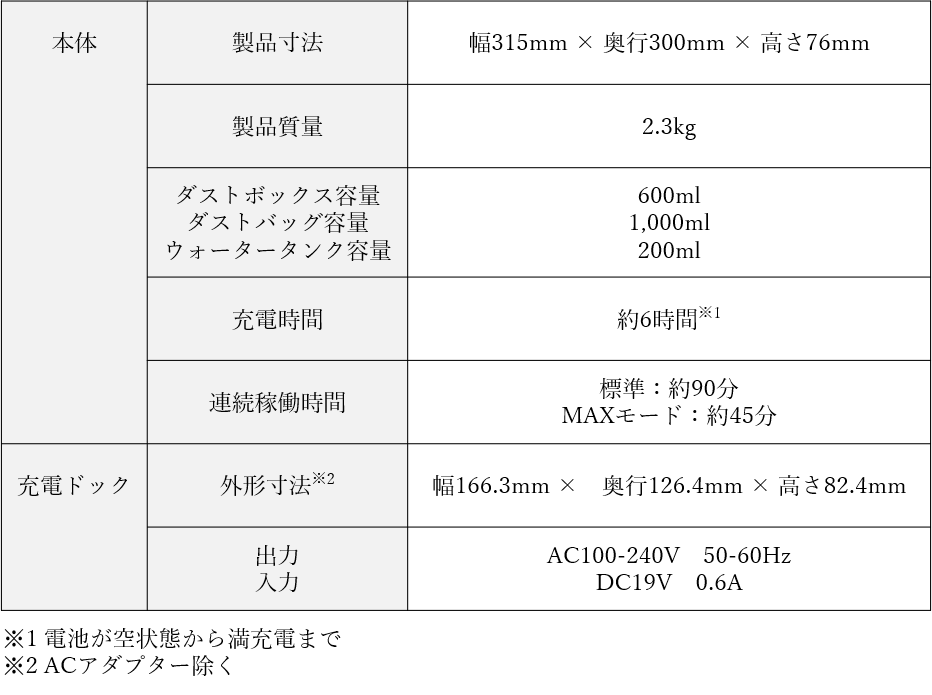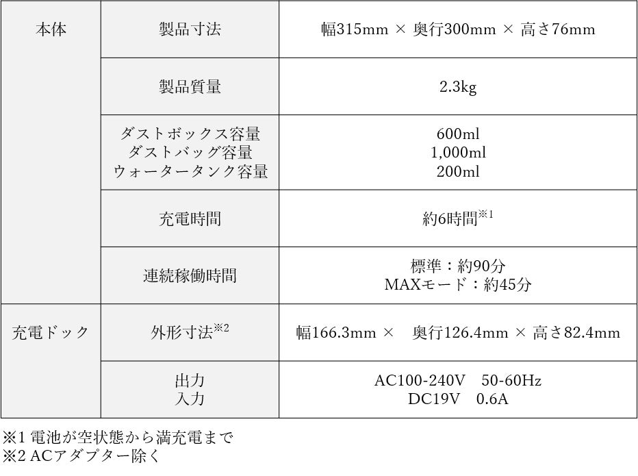 従来の機能や性能はそのままに、水拭き用ウォータータンク容量を200mlに従来から大幅アップ。