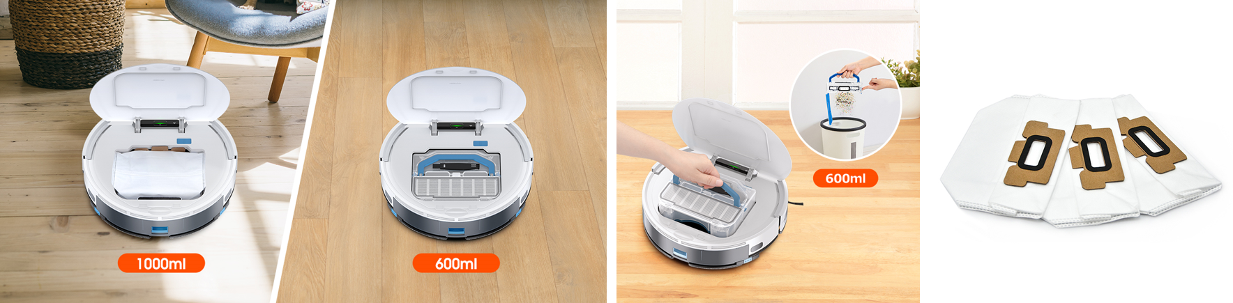 ダストボックスの清掃が面倒だ、というお客様の声にお応えして、ダストバッグを採用することで、ロボット掃除機のダストボックスの清掃のストレスを大幅に軽減することを目指しました。ダストバッグは大容量の1,000ml。本体購入時にはダストバッグ3枚が付属。