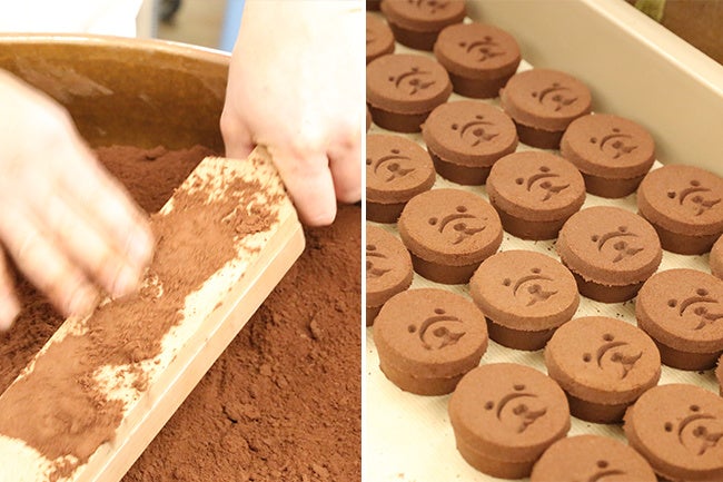 犬の木型は、100年以上前の型を復元し、ココアのお干菓子をつくりました。(上の画像は当時の図案と木型)