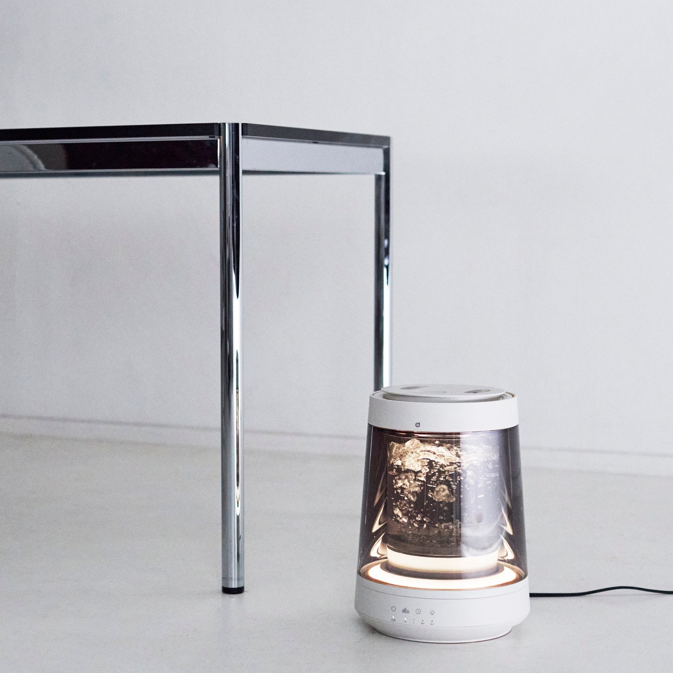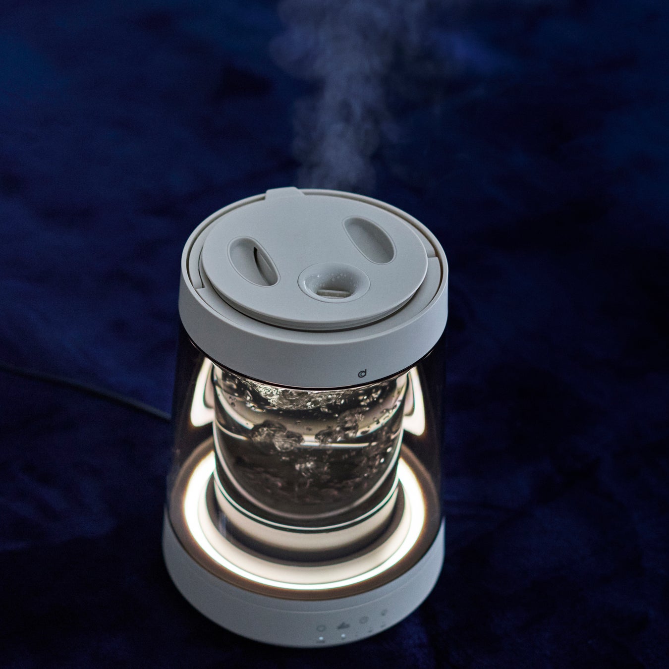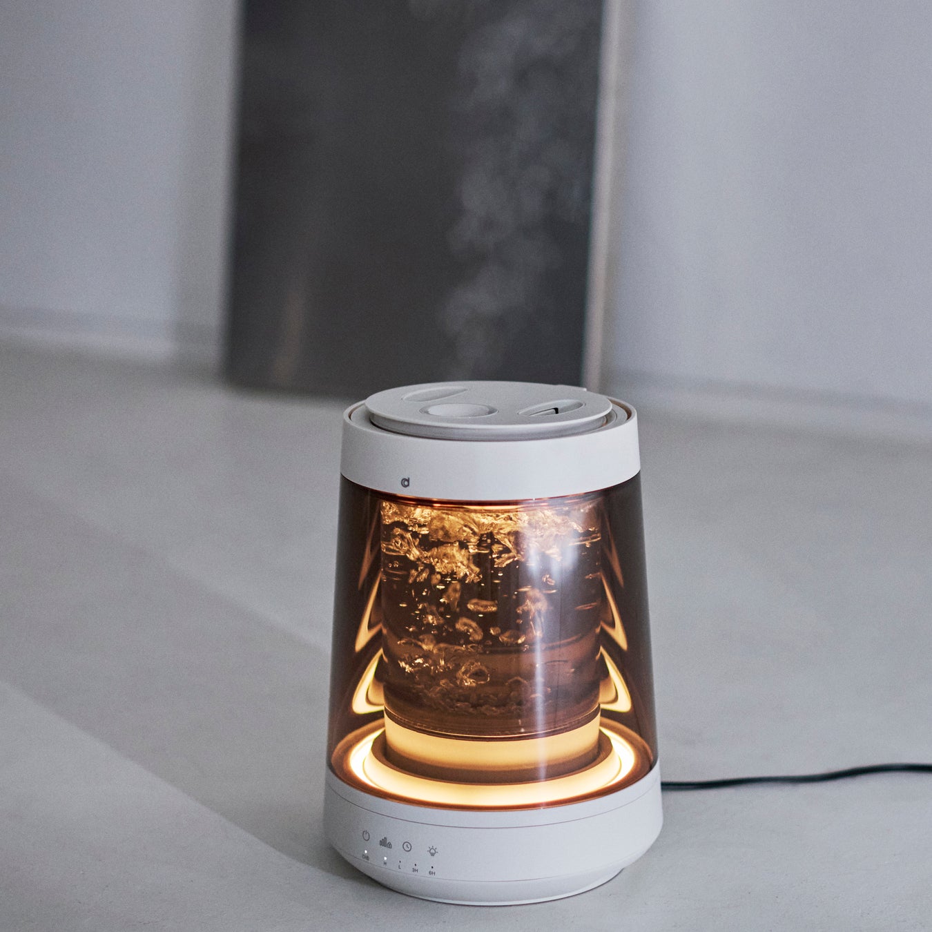 沸騰した水から生まれるピュアなスチームが、空気をやさしく潤し、4段階の照明モードが水の動きと呼応するインテリアのように美しい新感覚のスチーム加湿器
