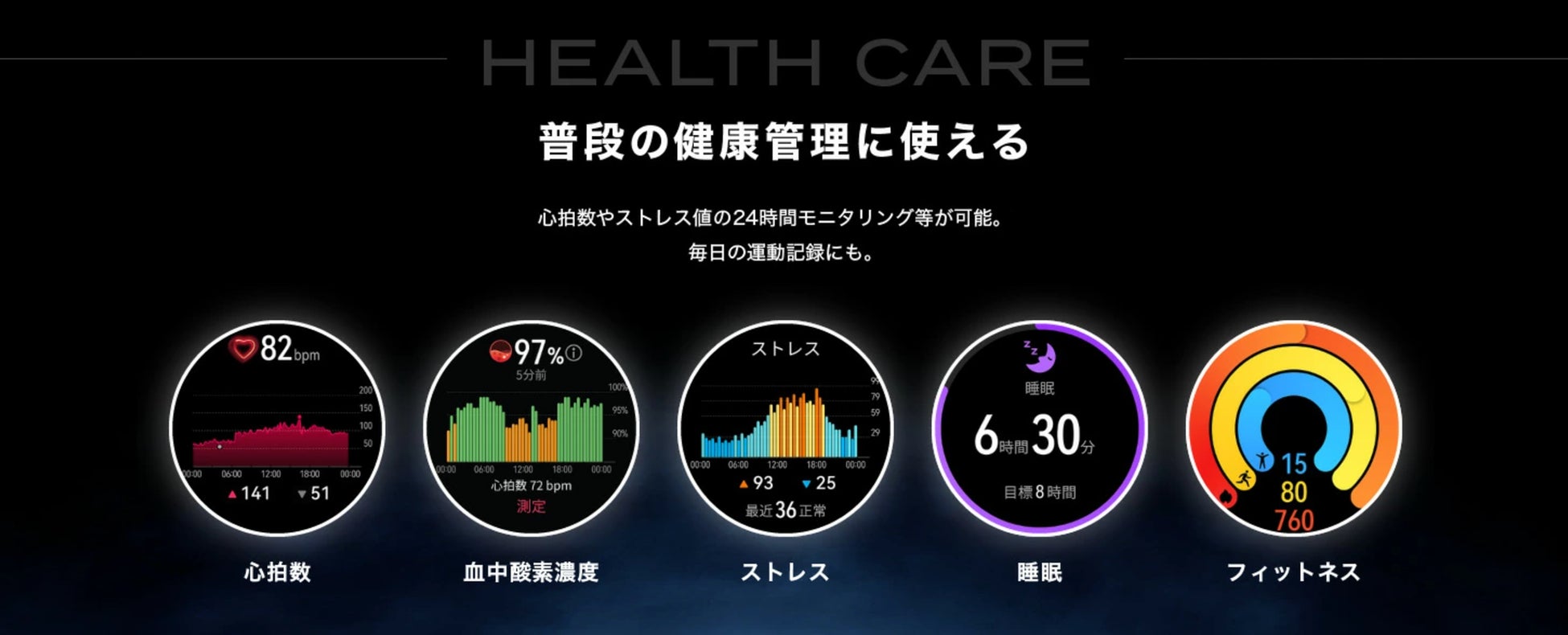 ゴルフプレー時にはもちろん、TECRAは毎日使えるスマートウォッチです。HUAWEI WATCH 4 Proの基本機能として心拍数、血中酸素濃度、ストレス値を24時間モニタリング。また睡眠状態の分析やスコアリング等に対応しています。その他、100種以上のワークアウトに対応し、普段の運動を記録するなど、健康管理にも活躍します。(※3)