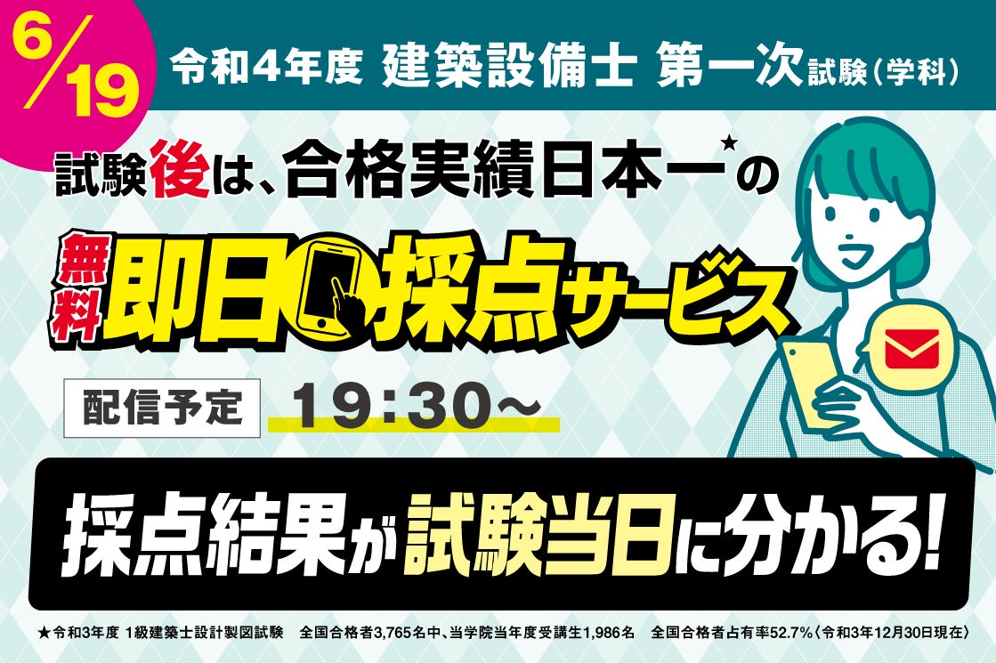 建設・不動産関連の資格取得スクール「総合資格学院」を運営する株式会社総合資格(本社:東京都新宿区、代表取締役:岸 隆司)は、2022年6月19日(日)に実施される2022年度(令和4年度)建築設備士試験「第一次試験」(学科)において、無料で採点結果をメールでお知らせする「即日採点サービス」を実施いたします。