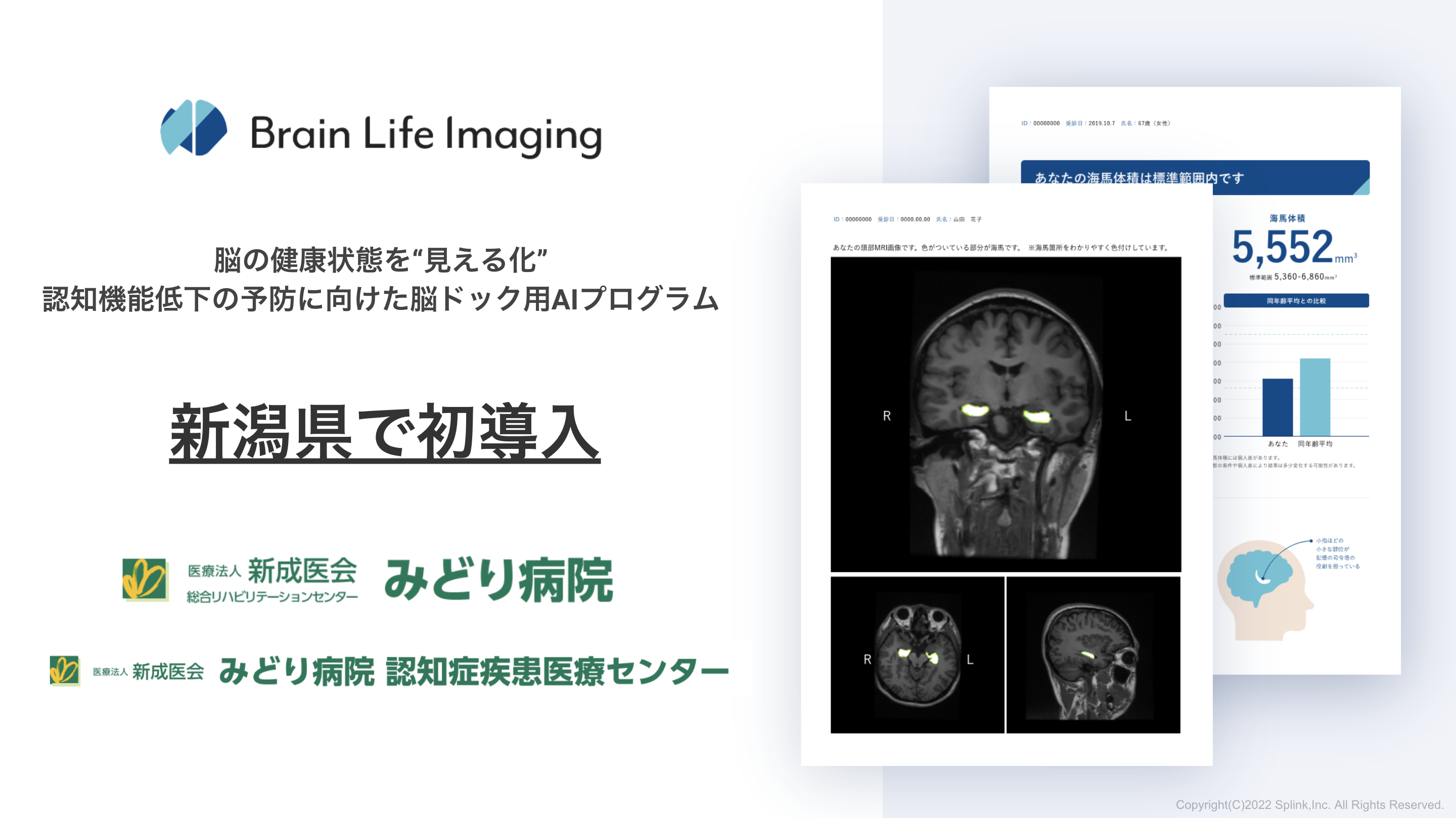 ブレインヘルスケア領域の医療AIスタートアップの株式会社Splink(本社:東京都千代田区、代表取締役:青山 裕紀、以下「Splink」)は、当社が開発・提供する脳ドック用AIプログラム「Brain Life Imaging®」(以下、Brain Life Imaging®)が医療法人 新成医会 総合リハビリテーションセンター・みどり病院(所在地:新潟県新潟市、病院長:成瀬 聡、以下「みどり病院」)にて導入されたことをお知らせいたします。なお、Brain Life Imaging®が新潟県で導入されたのは、みどり病院が初めてとなります。