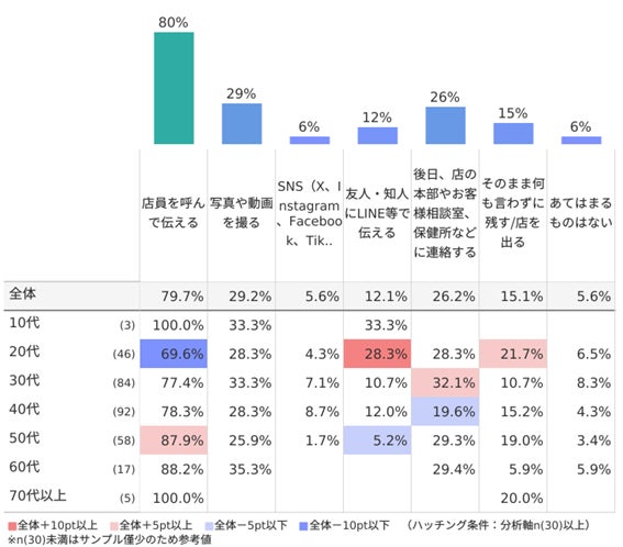 また年代別で見ると、20代では「LINE等で伝える」と回答した人が28.3%と他の年代よりも多く出ており、「SNSに投稿する」と回答した人は、30代が7.1%、40代が8.7%と高い傾向にありました。一方、50代以上ではそれらを選ぶ人は少なく、「店員を呼んで伝える」が20〜40代よりも多く回答されており、拡散行動よりも直接的な対応を選ぶ傾向が見られました。