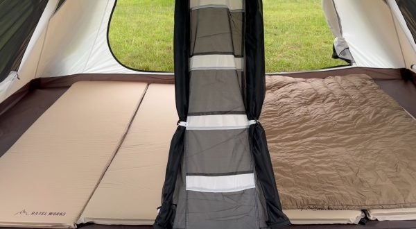 前室より広い寝室は、140cm幅のダブルマットを2枚設置しても、十分に荷物のスペースができ、広々と就寝するこができます。インナー内でくつろぎながらトランプゲームや、冬のおこもりスタイルでは、ゆっくり、のんびり広々過ごせる空間になること間違いなしです。
