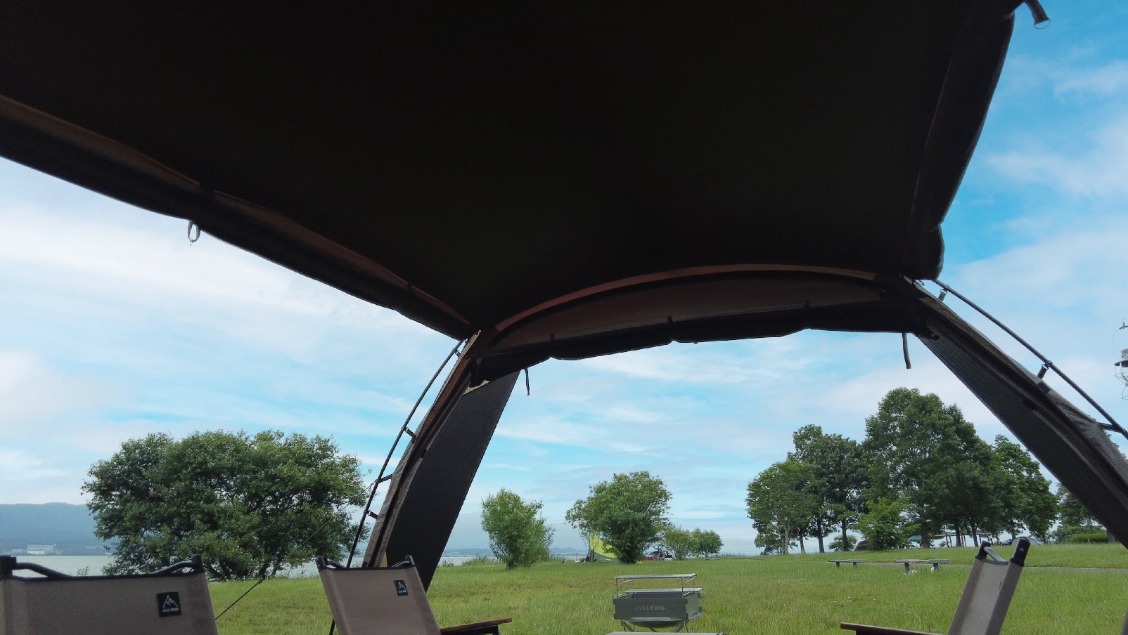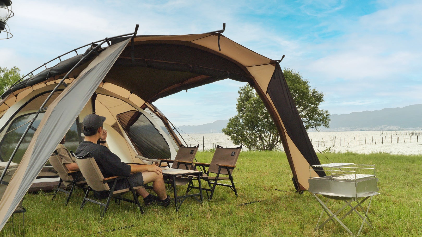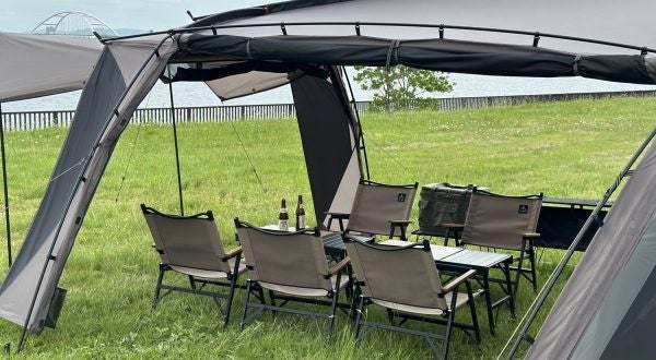 ドーム型のメリットである、居住空間の最大化に加え、後方から前方にかけて張り出しを作ることで、別でタープを用意する必要が無く、リビングスペースを設けることが可能に。また、跳ね上げをすれば幅5m以上の前室を作ることも可能。
