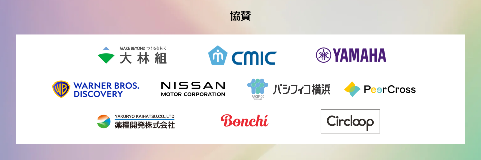 協 賛:株式会社大林組、シミックグループ、ヤマハ株式会社、ワーナー ブラザース・ディスカバリー、日産自動車株式会社、パシフィコ横浜、PeerCross、薬糧開発株式会社、株式会社Bonchi、株式会社Circloop