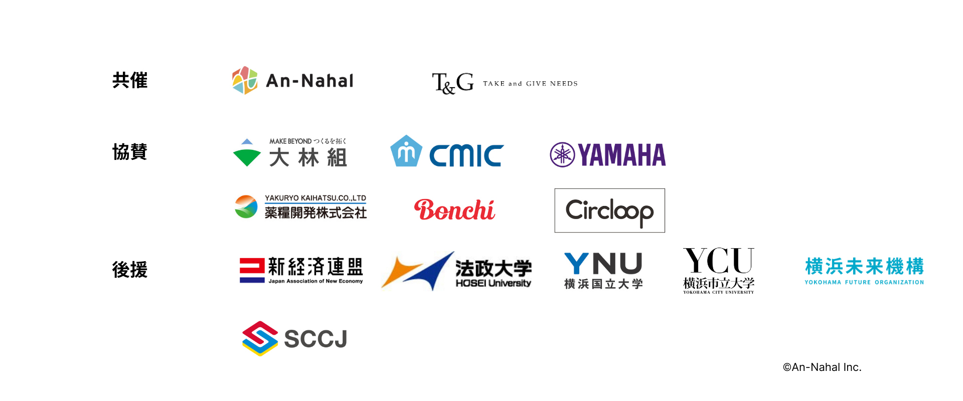 協 賛:株式会社大林組、シミックグループ、ヤマハ株式会社、薬糧開発株式会社、株式会社Bonchi、株式会社Circloop