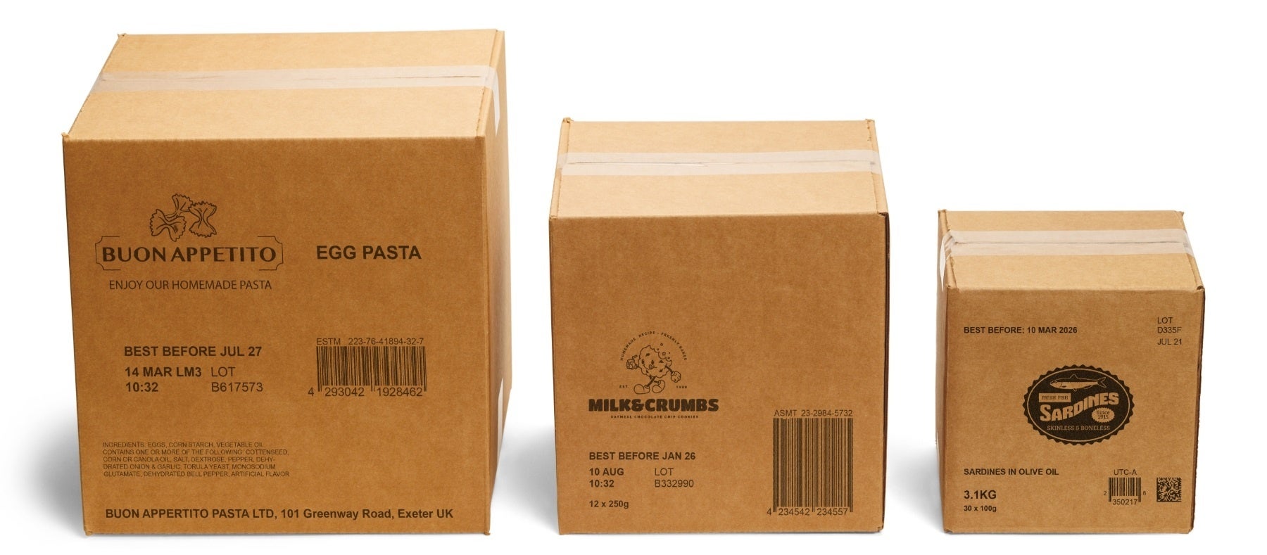 解像度 180 dpi の印字を可能とする本プリンタは、文字や日付だけではなく、バーコードやシンボルマークの印刷も可能です。出荷業務を行う工場などの拠点で本プリンタをお使いいただくことで、在庫としてストックされている段ボール箱に必要な分だけご希望の内容を印刷していただけるようになります。例えば季節性の商品を出荷するための段ボール箱など、ある時期を過ぎると使えなくなるデザインの箱を余らせて無駄にしてしまうリスクを抑制できます。