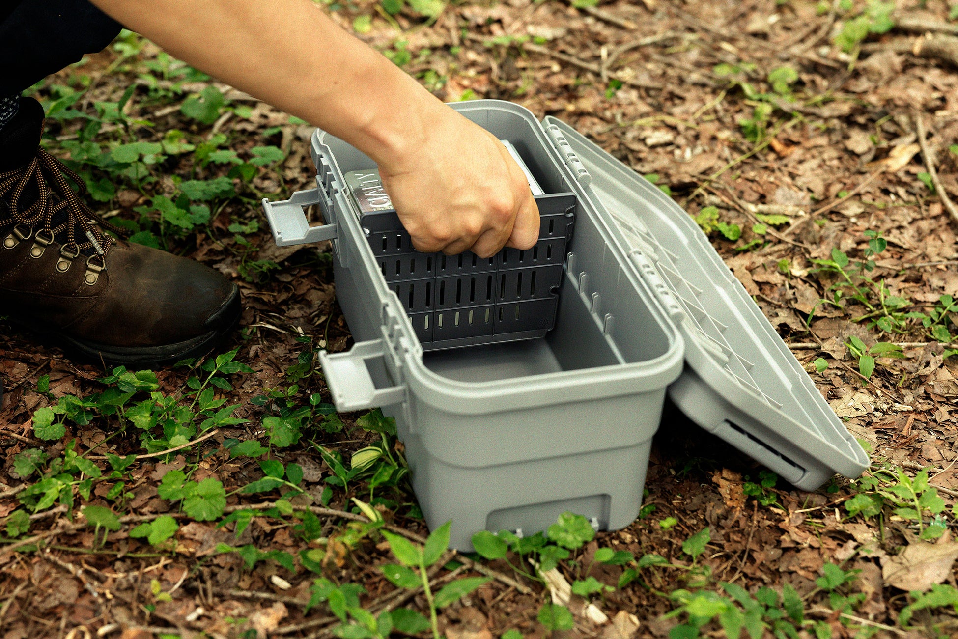 トランクカーゴは「細々した道具を収納するコンテナが欲しい!」とのユーザーの方々の意見を基に、小型コンテナの開発を行いました。キャンプユーザーの方々は、道具を用途ごとに容器を分けて整理する方が多いということに着目し、容器を分けると同時に持てなくなるという課題を解決する為に、積み重ね連結の機能のある小型コンテ ナのスタックカーゴを開発しました。また、トレーや仕切板のオプション品を別売とすることで、必要に合わせてカスタマイズできる自由度もあります。素材は、プラスチック製で、雨や泥による汚れもサッと拭くだけで落とすことができます。耐荷重は20kgで上にモノを載せられ、ストレスなく使用することができます。用途としても、従来のキャンプ意外にもDIYの工具、釣り道具、車やバイクのメンテナンス道具など様々なシーンで使うことができます。