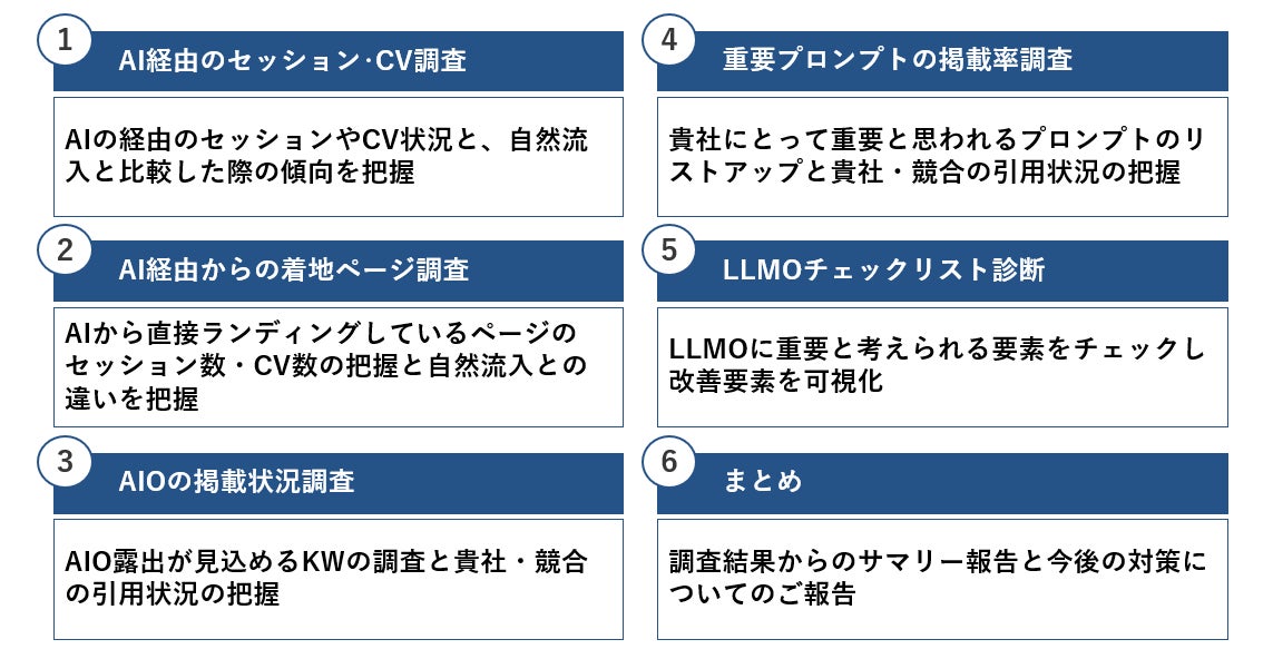 まずは、AIの流入状況やAIと自然流入の違い、GA4をベースに現状の流入状況を調査します。そして、AIOの引用率、競合の露出状況、AIOで狙えるKWのリストアップと引用状況などの調査を行い引用状況を可視化します。