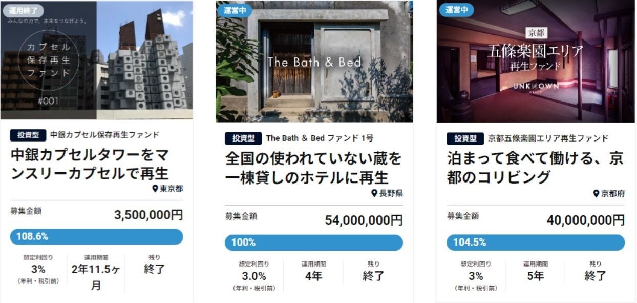 私たちは、2017年に立ち上げた当サービスを活用して資金調達し、全国各地域の空き家や遊休不動産の再生に取り組んできました。中銀カプセルの再生(宿泊施設への転用)は、遊休資産の活用だけでなく、設置場所(自治体)への誘客や活性化につながるものだと考えています。2018年には中銀カプセルタワービルの一つのカプセルをリノベーションして賃貸事業を行うプロジェクトでも活用しました。また、横須賀市内では、このほかにも、ファンドを活用した地域再生に取り組んでいます。ご注目ください。
