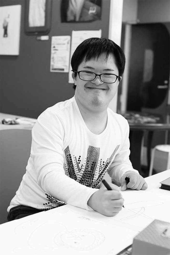 1999年⽣まれ。題材は、彼が興味のあるもの全て。様々な⾊で描かれた作品は、彼の明るさそのもの。作品を⾒ているだけで、⼈を元気にする魅⼒がある。迷いなく描く姿は、⼤胆かつ繊細。