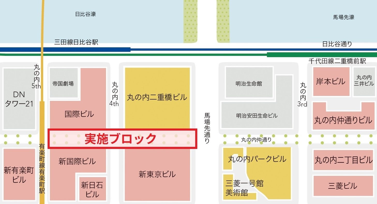 【設置場所】丸の内仲通りアーバンテラス 丸の内二重橋ビル・国際ビル前ブロック(下図参照/雨天・強風時およびイベント開催時は中止)