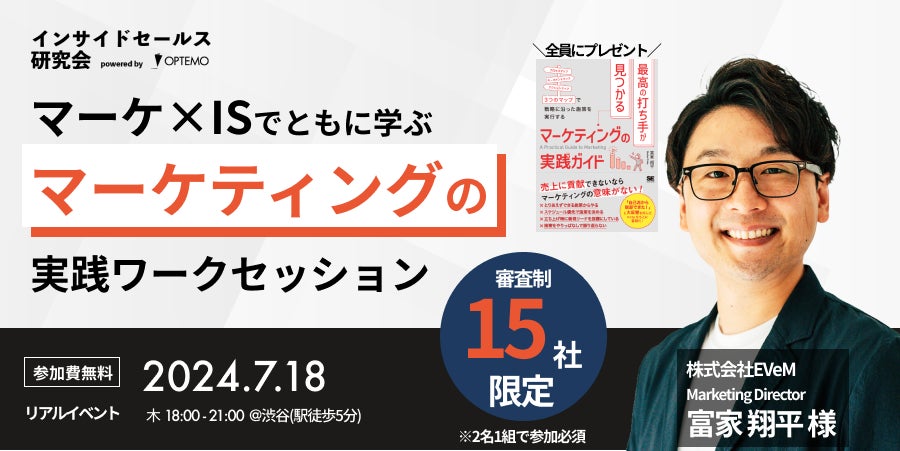 株式会社OPTEMO(本社:東京都千代田区、代表取締役:小池桃太郎、以下OPTEMO)は、2024年7月18日に「マーケ×ISでともに学ぶマーケティングの実践ワークセッション」と題してインサイドセールス研究会7月例会を開催します。