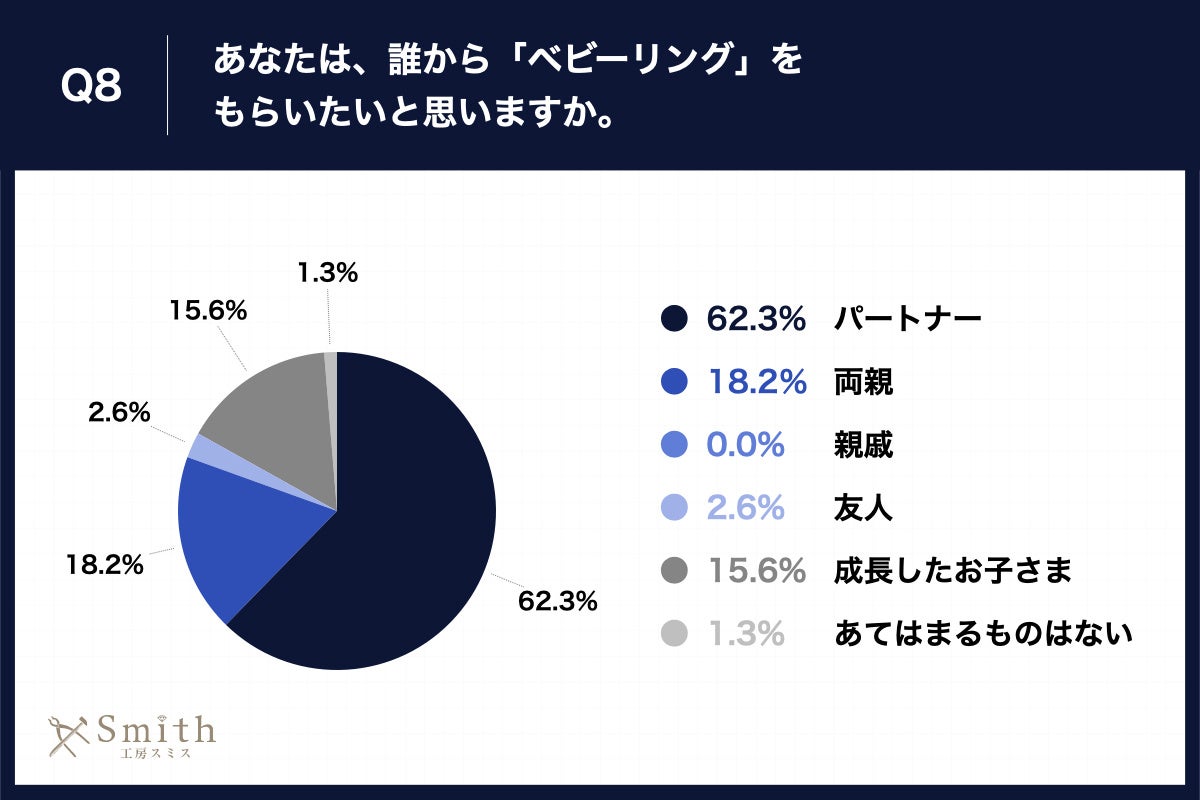 Q6で「非常にそう思う」「ややそう思う」と回答した方に、「Q8.あなたは、誰から「ベビーリング」をもらいたいと思いますか。」(n=77)と質問したところ、「パートナー」が62.3%、「両親」が18.2%という回答となりました。