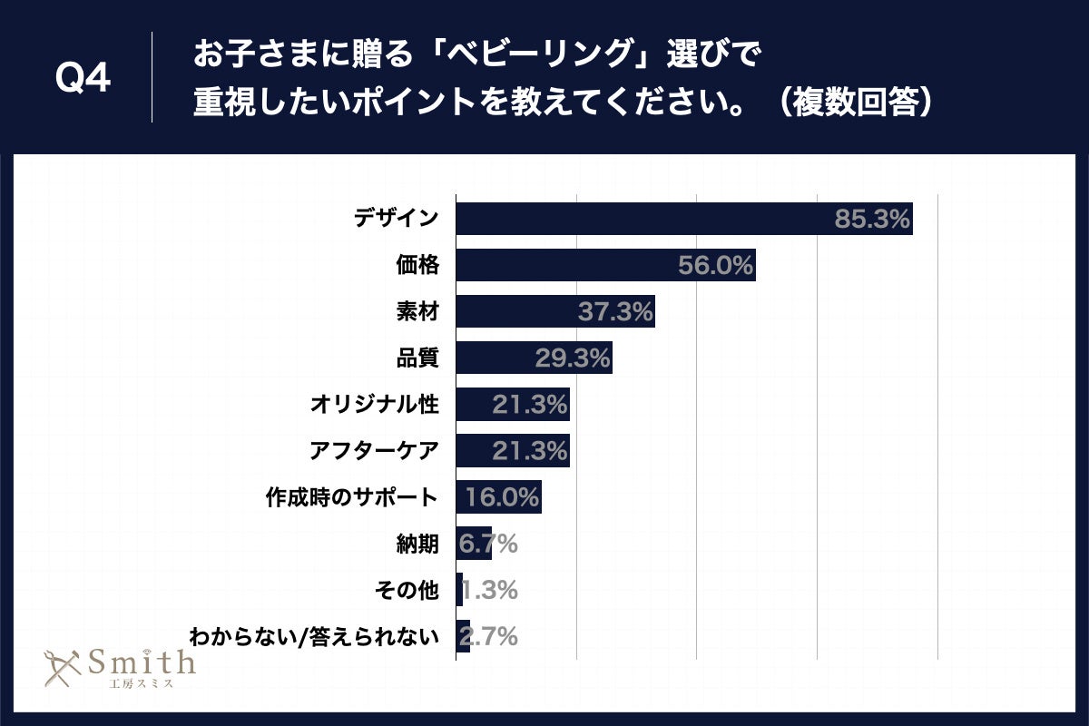 Q1で「非常に興味がある」「やや興味がある」と回答した方に、「Q4.お子さまに贈る「ベビーリング」選びで重視したいポイントを教えてください。(複数回答)」(n=75)と質問したところ、「デザイン」が85.3%、「価格」が56.0%、「素材」が37.3%という回答となりました。