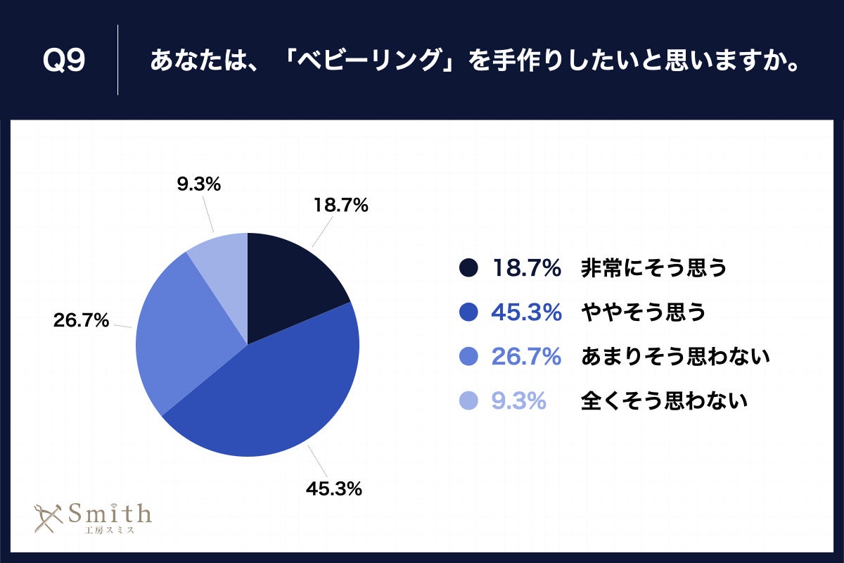 Q1で「非常に興味がある」「やや興味がある」と回答した方に、「Q9.あなたは、「ベビーリング」を手作りしたいと思いますか。」(n=75)と質問したところ、「非常にそう思う」が18.8%、「ややそう思う」が45.3%という回答となりました。